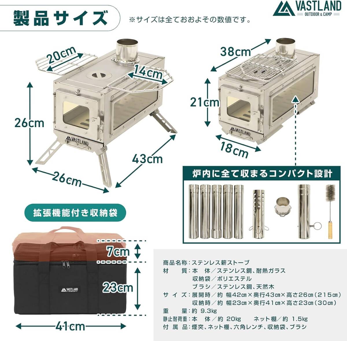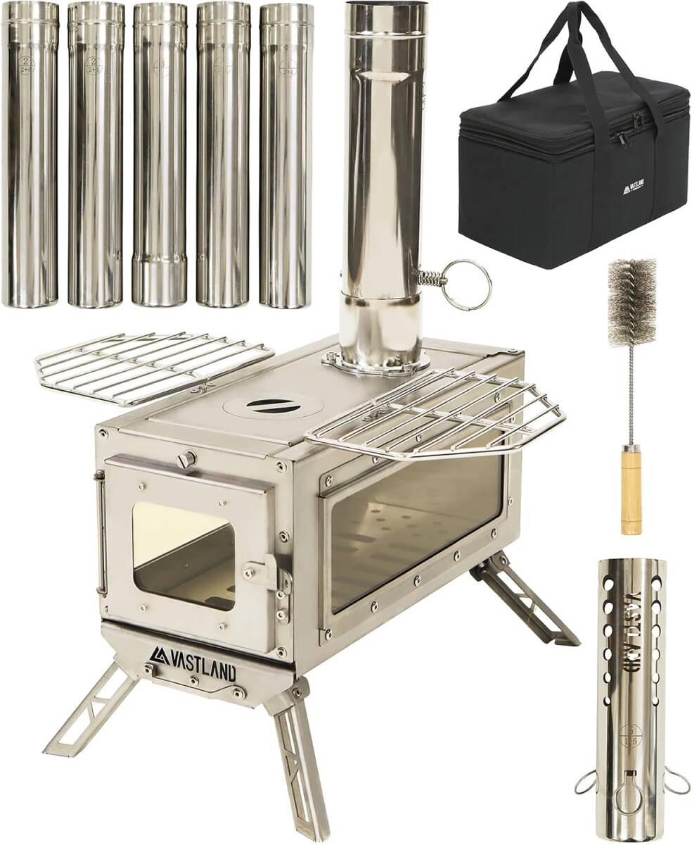 熱々の料理を提供出来る VASTLAND 薪ストーブ キャンプ ストーブ 小型 ステンレス 3面耐熱ガラス窓 煙突長さ215cm