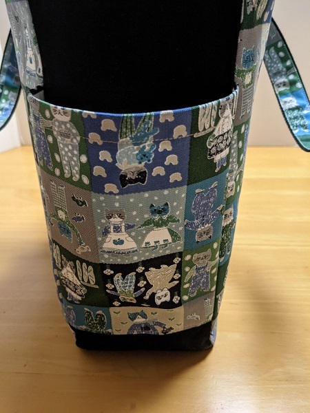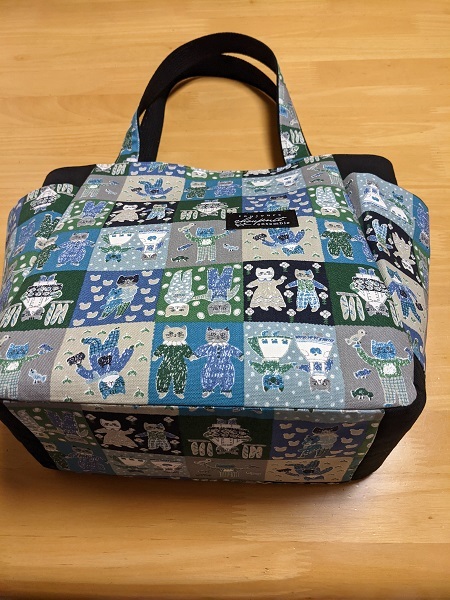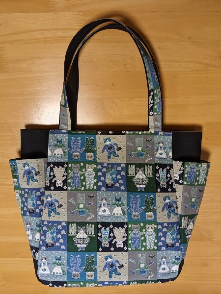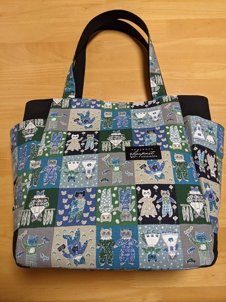 ブルー系で可愛いコンビのねこちゃんのブロック柄の生地で両サイドにポケットのついたおしゃれなチューリップトートバッグです。