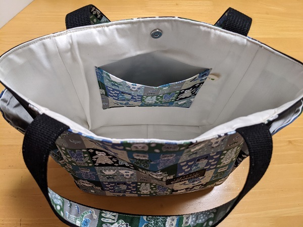 表地には厚手の接着芯を貼 り、裏布オフホワイトでテトロンと綿の混紡生地を使用してますのでしっかりしたトートバッグになっています。