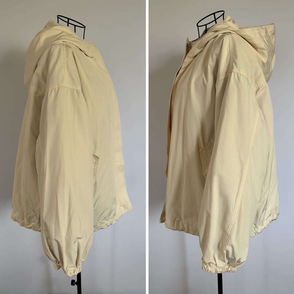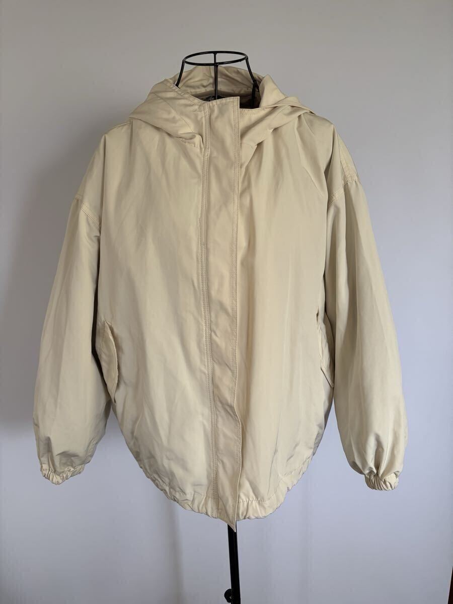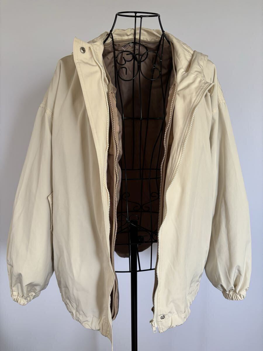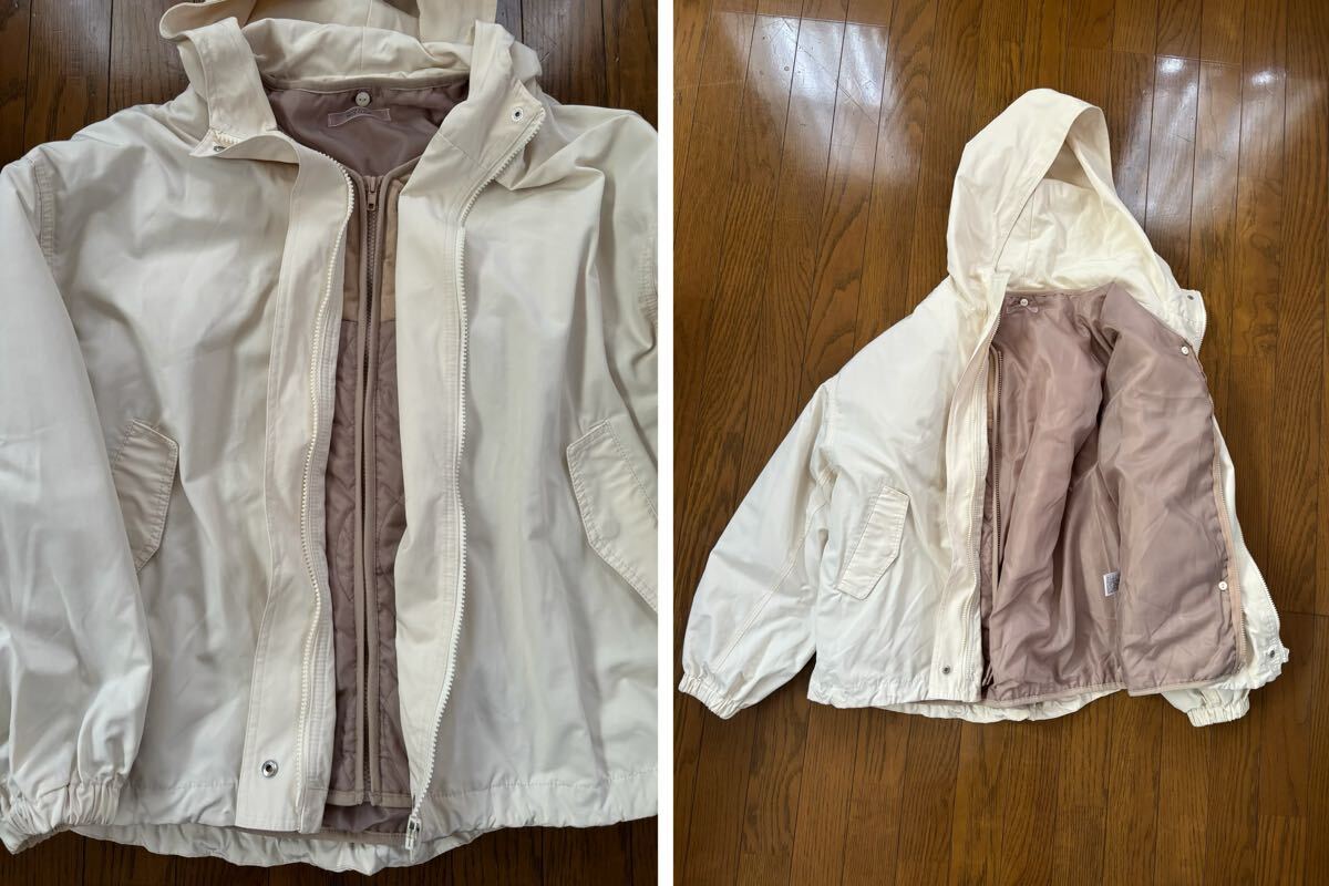 外側は柔らかなベージュカラーのフード付きジャケット、