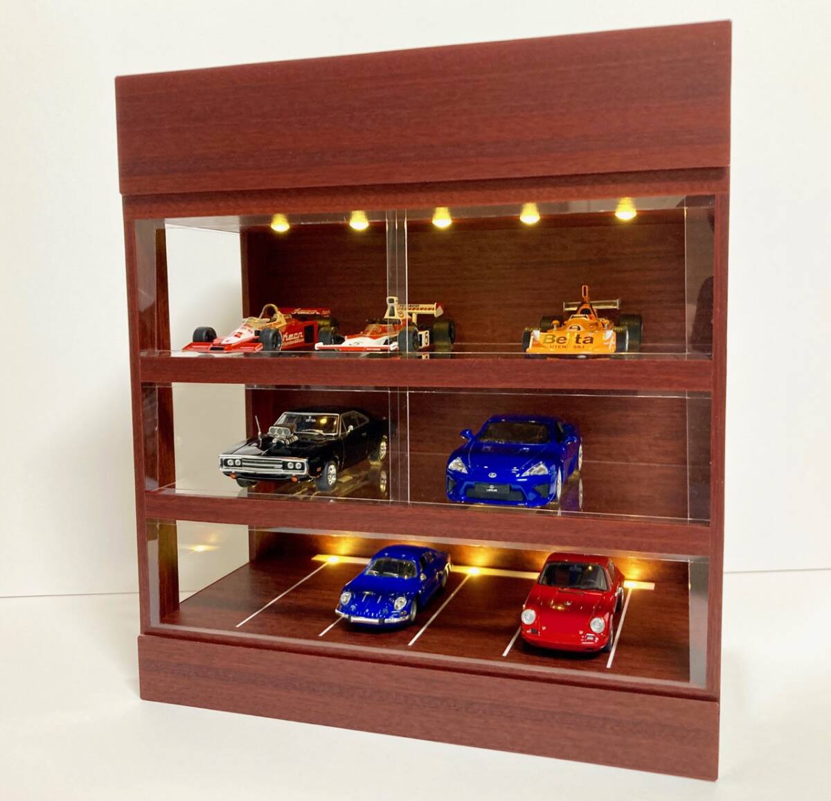 | 1/43展示15台可能・マホガニー・3層式ディスプレーBOX / LED照明10灯・スタイリッシュジオラマ・京商、1/64にも | ||||||||||||||||