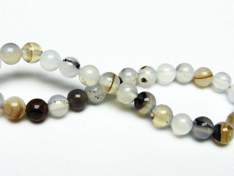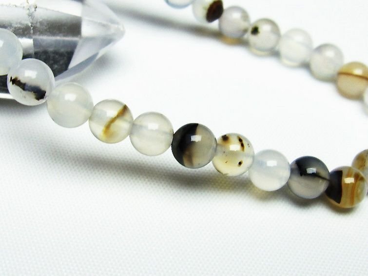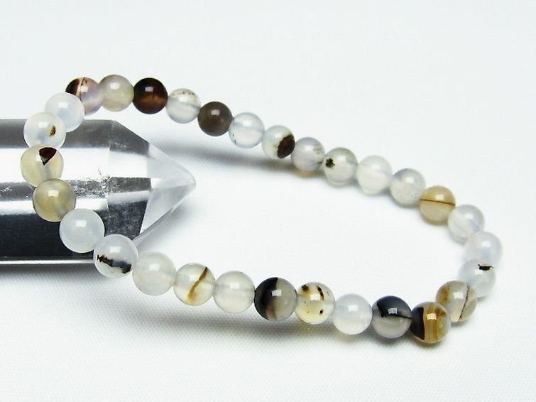 ■商品名: デンドリック アゲート ブレスレット ■商品ID: T108-5595 ■商品重量:約 10.1g ■商品サイズ:内周約:157mm(±5mm)粒直径約:6mm(±0.5mm)~7mm(±0.5mm) 【アゲート(瑪瑙)】 和名では瑪瑙(めのう)といい、アゲートの模様が馬の脳のように見える事からこのような名前が付けられました。 アゲートは赤、緑、青、黄、黒など、様々な色に着色されることで石本来のパワーがさらにアップするといわれており、着色により魅力を増す天然石はアゲートだけとも言えます。 さらにはアゲートを組み合わせるとペアになっているペアアゲート(トレジャーメノウ)は龍穴を生み出すとされ、風水的にも良いといわれています。 アゲートは古来より日本やインドやチベットなどで魔よけやお守りとされてきました。 失敗や不幸を遠ざけ金運や仕事運、成功運とも結び付けてくれる効果のほか、安産のお守りにも良いとされています。 さらに家庭円満や対人関係をスムーズにするなど、オールマイティな効果を持った石です。 ⇒ アゲートをもっと詳しく ◆ワンポイント情報 アゲートはカルセドニーの変種で、染色がされていなくともそれぞれの種類に多様な色があります。 ざっと仲間を挙げてみてもオニキス(黒)、サードニクス(橙色)、ブルーアゲート(青)、グリーンアゲート(緑)、イエローアゲート(黄)、ブルーレースアゲート(縞青)、モスアゲート(縞緑)、天眼石(縞黒)、カーネリアン(橙色)、ジャスパー(多様な縞)などとても多くの特徴と色合いを持っています。 |