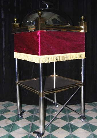 演者は食堂のカートのカバーを取り除きます。