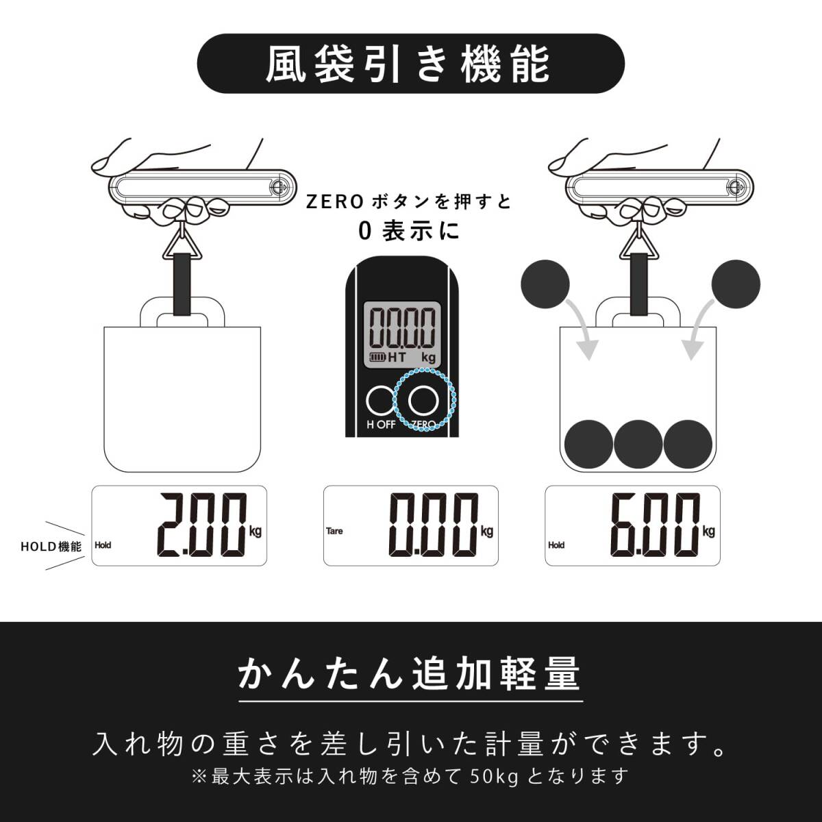 荷物の重さをボタン押して吊るすだけでサッと計測できるラゲッジスケールです。 飛行機の荷物確認、荷物の送料確認、アウトドアの重量確認、体重計では計測しにくいものの重量確認に役立ちます。