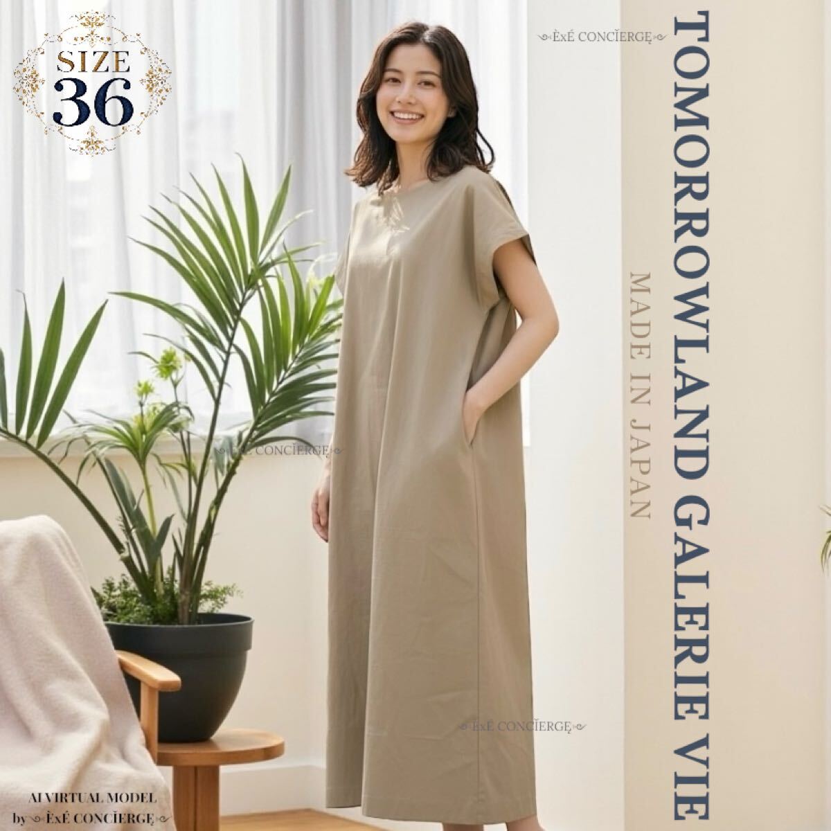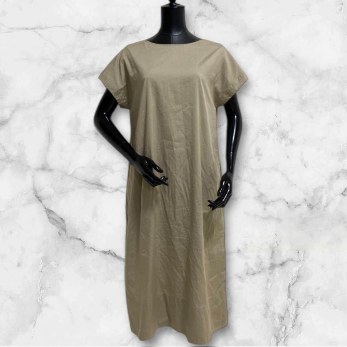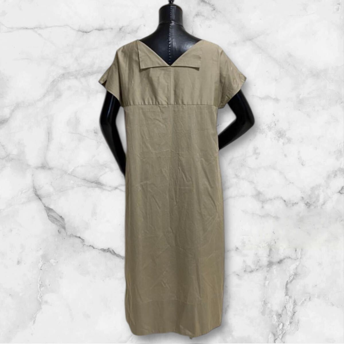 TOMORROWLAND GALERIE VIEのリラクシーワンピース。完売品。参考定価6万。選び抜かれたコットンにシルクを贅沢ブレンド。シンプルデザインでゆったりワイド幅でご着用頂けます。バックネックラインの折り返しも魅力。洗練されたシルエットと芸術的なひねりが効いたアイテム。クリエイティビティとクラシックエレガンスの融合。カラーはライトカーキ系。日本製。国内正規品。両サイドポケット配置。