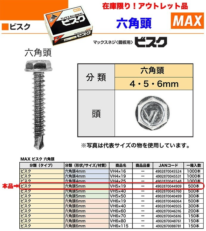 【在庫限り!アウトレット品】 〈MAX〉ビスク 六角頭5mm VH5×19 〔1箱・500本入り〕 【オススメ】