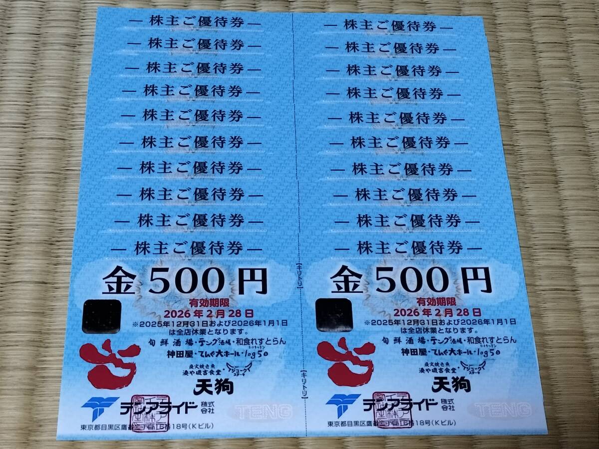 ご覧いただきありがとうございます。 テンアライドの株主優待券 10,000円分(500円券x20枚)です。 〇有効期間は2026年2月28日までとなります。 〇全国の「旬鮮酒場」「和食れすとらん天狗」「テング酒場」「神田屋」「ミートキッチンlog50」「てんぐ大ホール」「ジュークステーキ」「とんかつかんだ」「湊や磯吉食堂」等で利用いただけます。 ご検討のほどよろしくお願い致します。 | ||