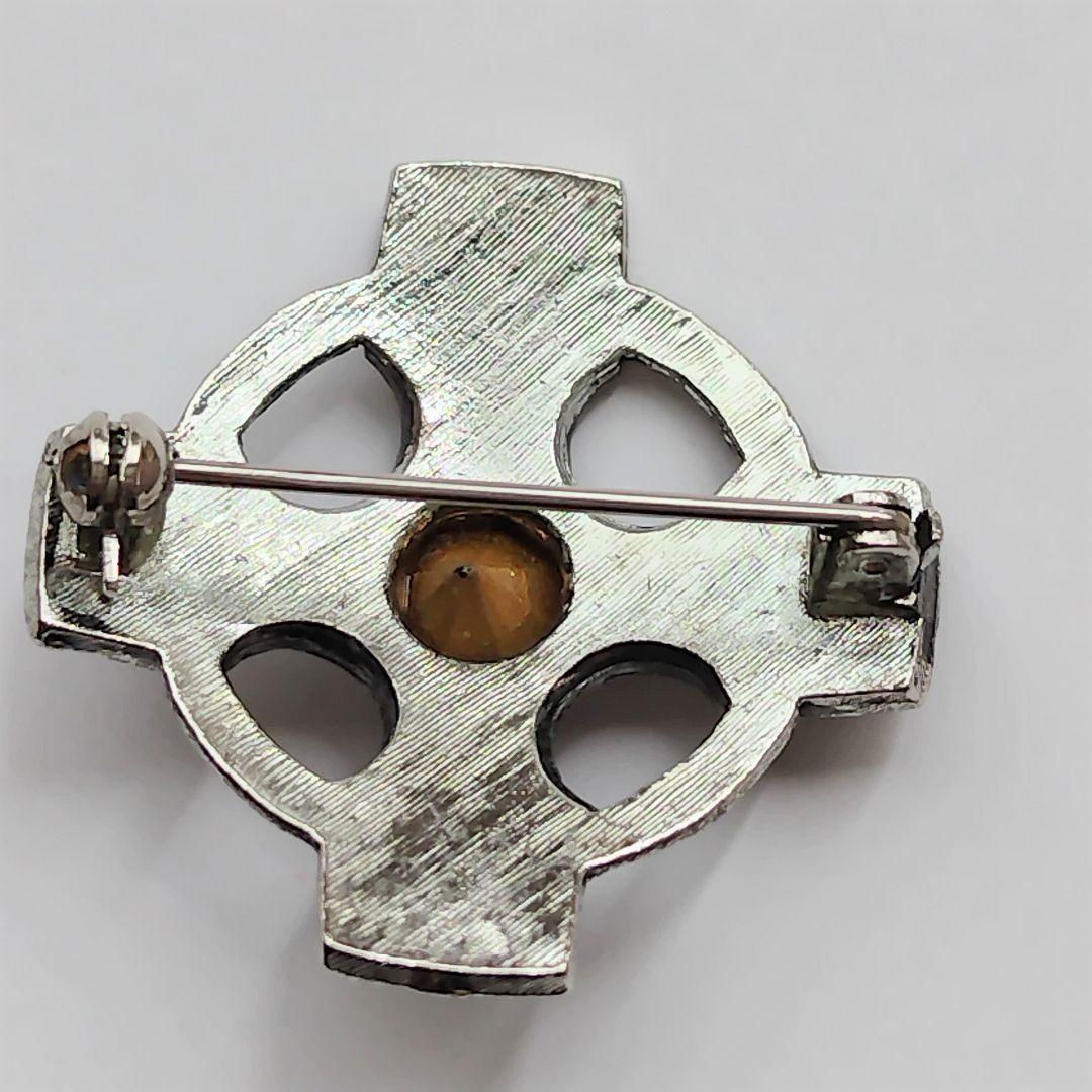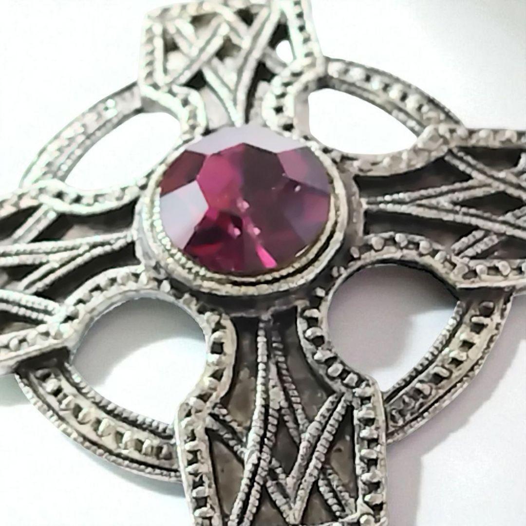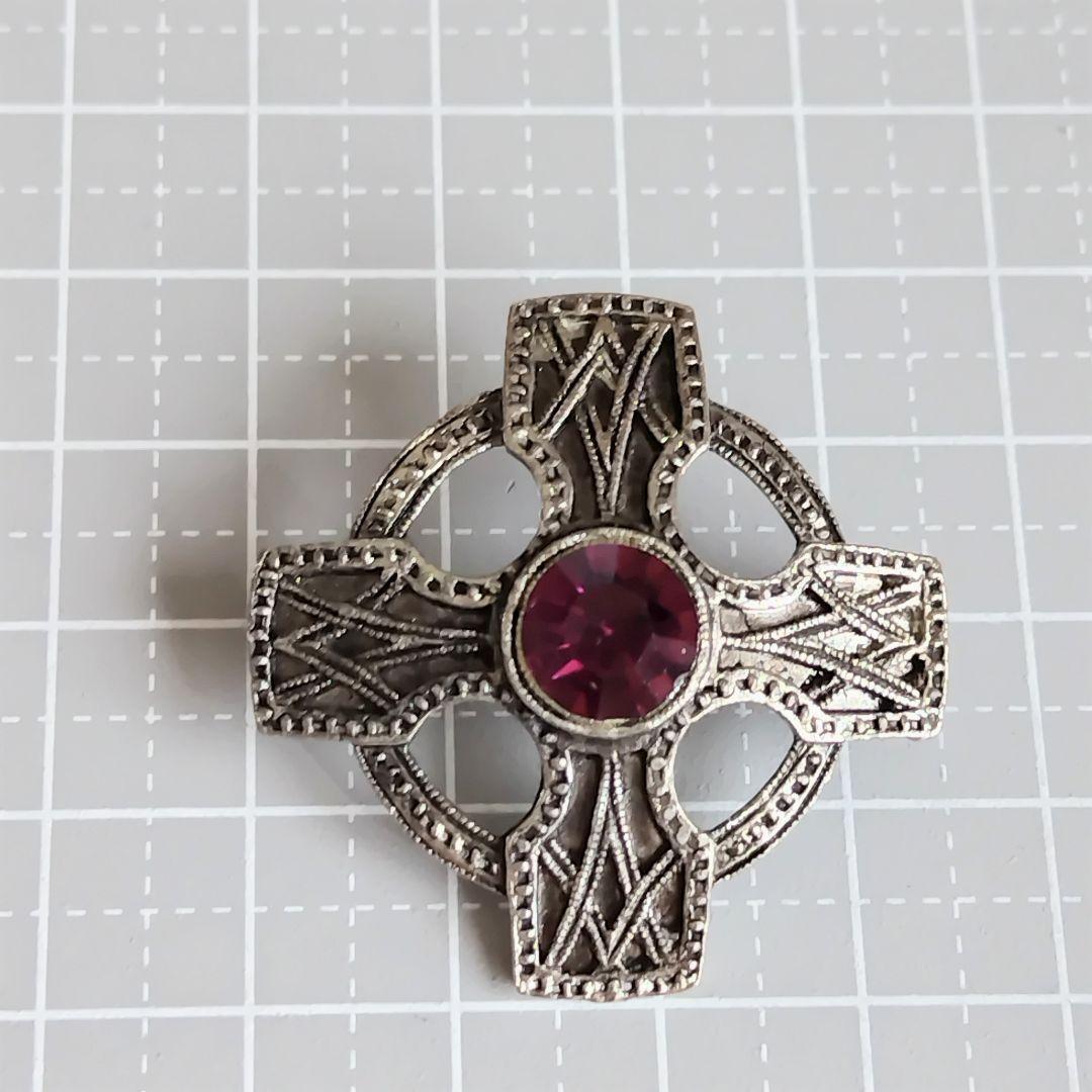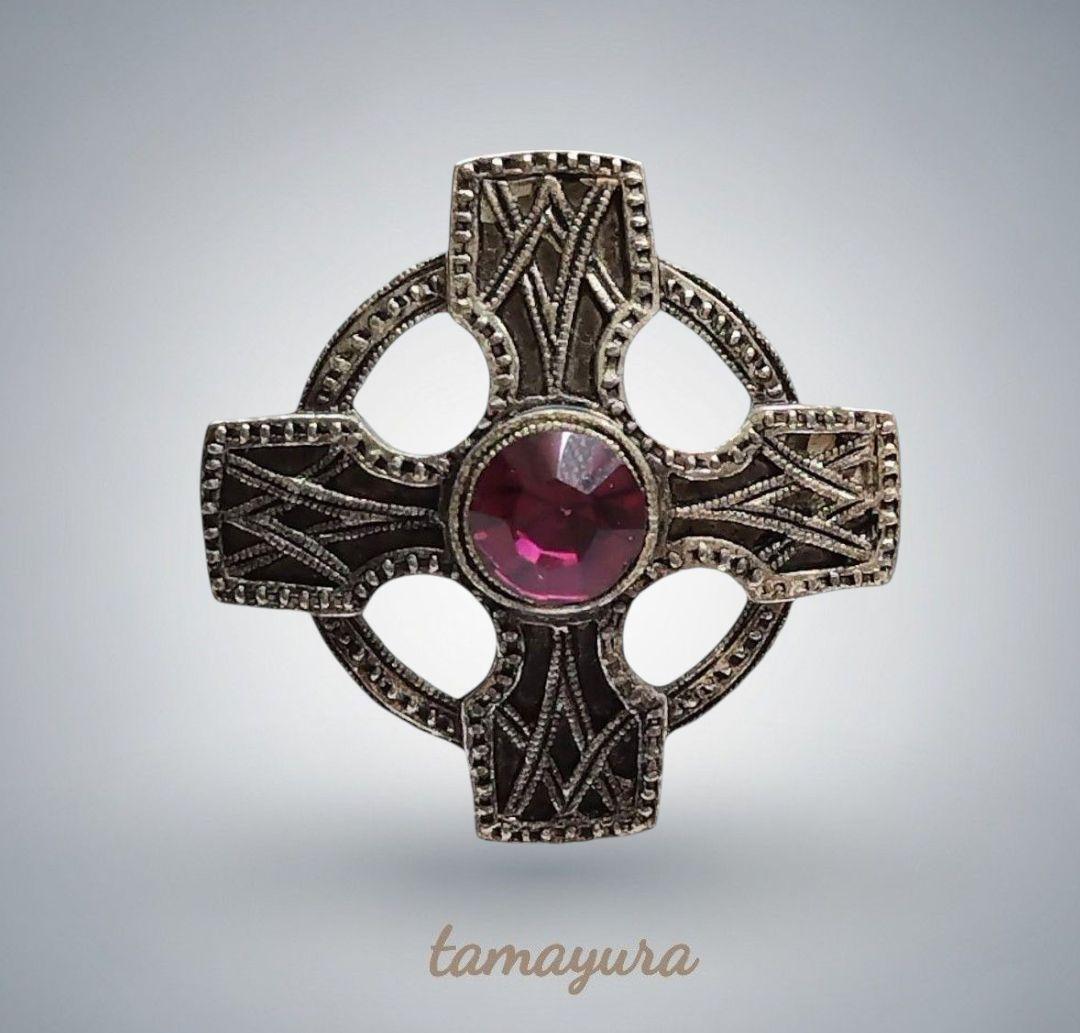 英国製 イギリス ヴィンテージ ブローチ ケルト十字 クロスモチーフ アメジストカラーガラス アンティーク