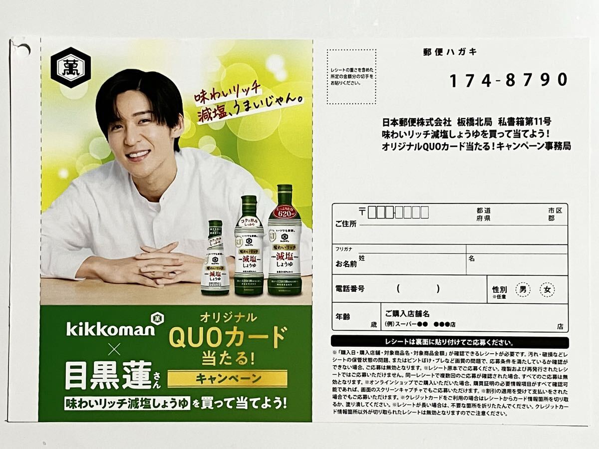 レシート懸賞 目黒蓮 さん オリジナル QUOカード 当たる! キャンペーン キッコーマン KIKKOMAN