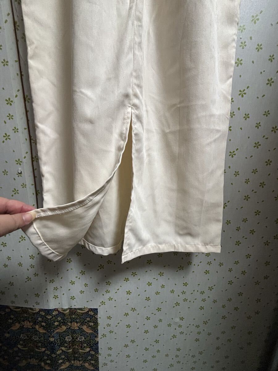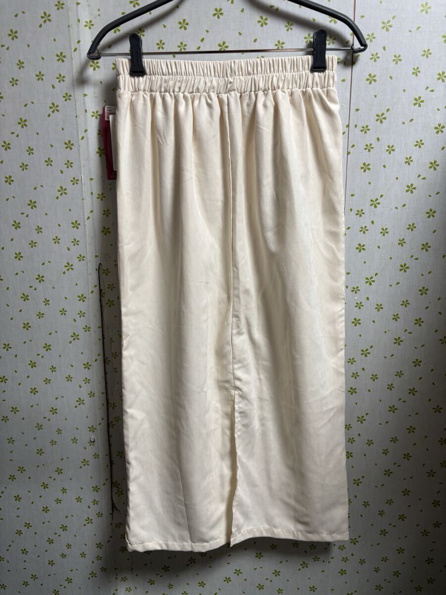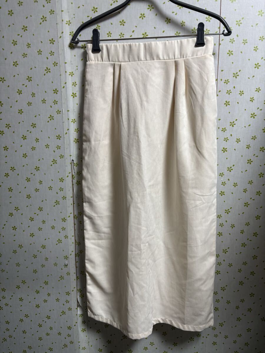 アイボリーのタイトスカート、ウエスト後ろ面ゴム仕様と後ろスリット入り。