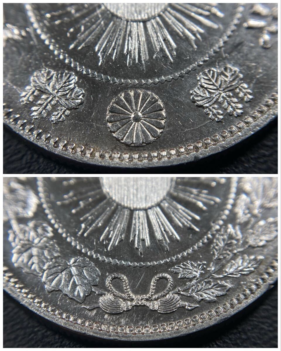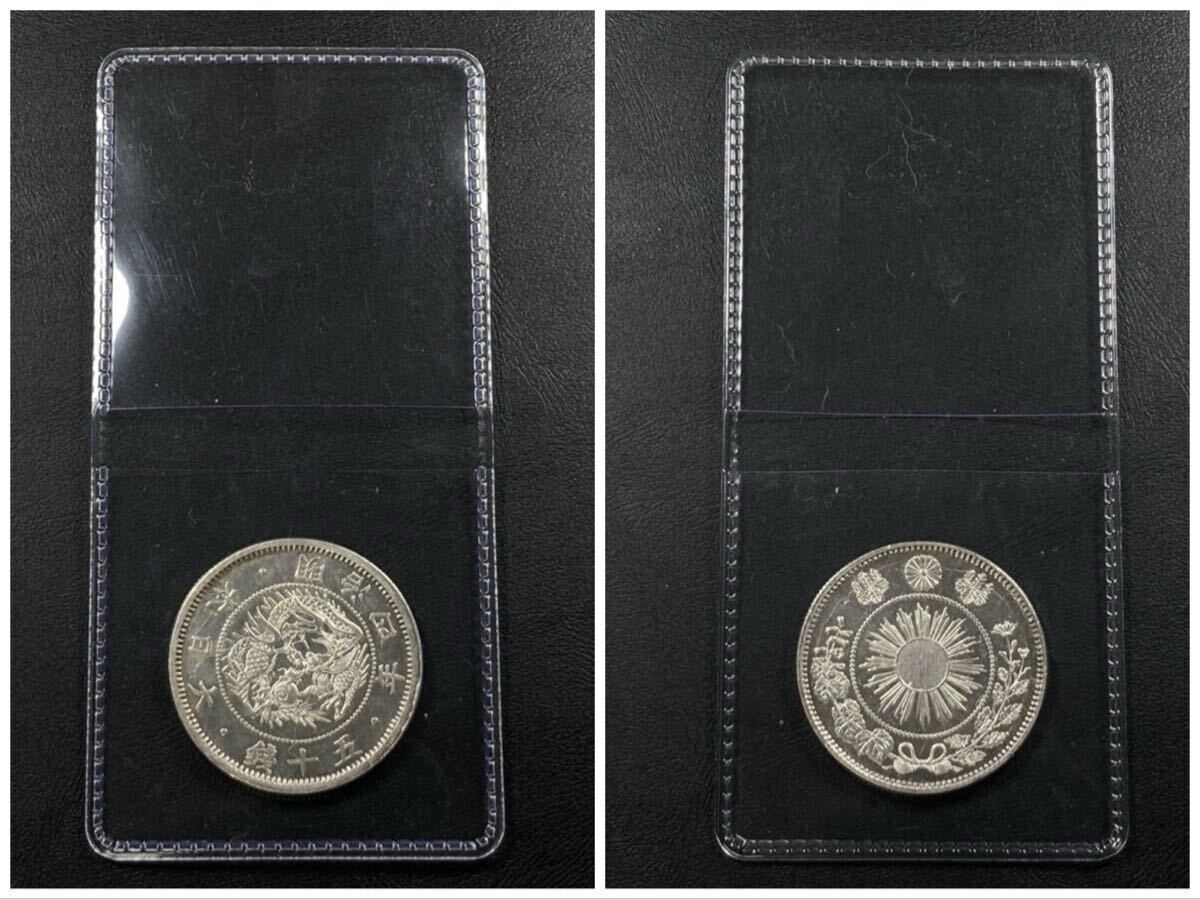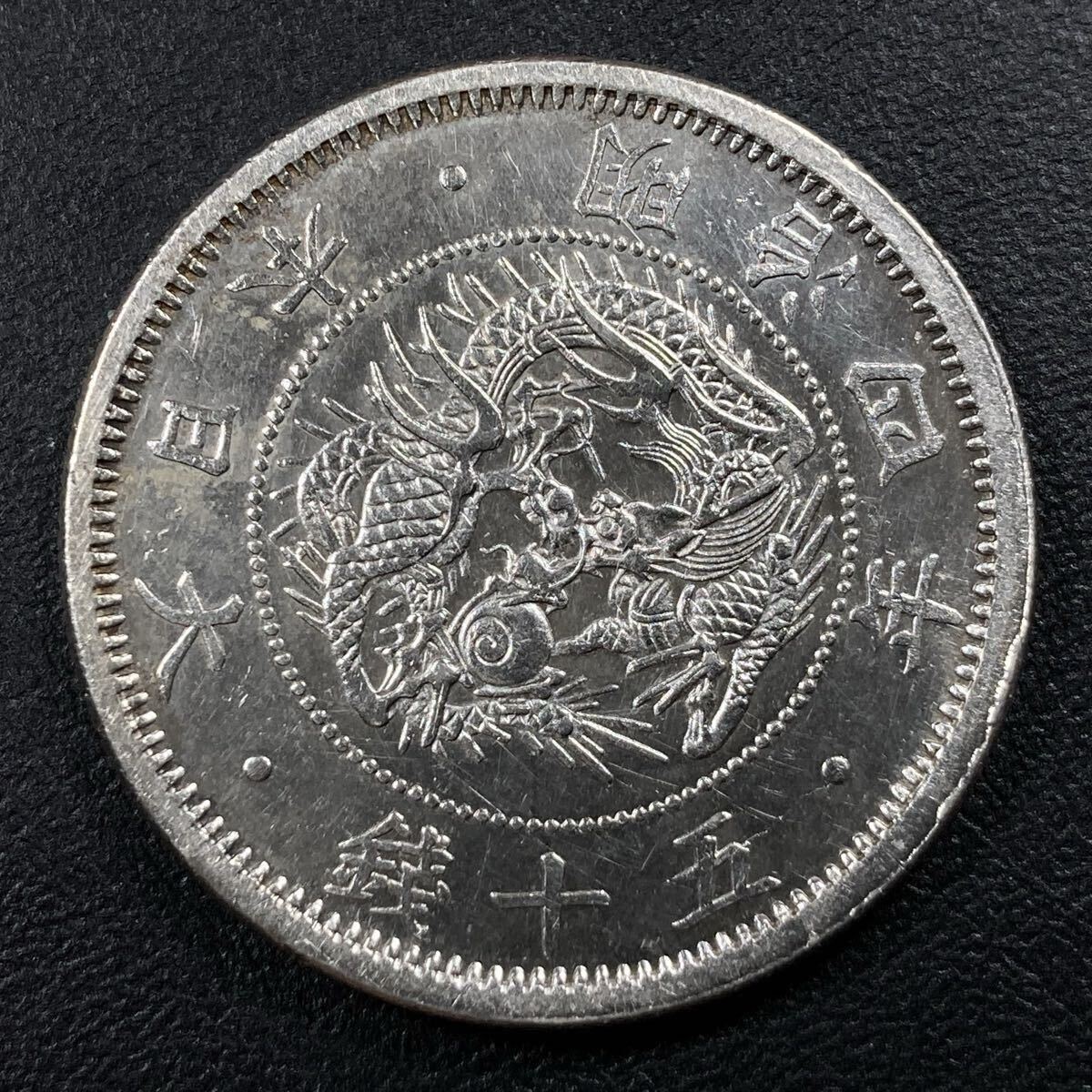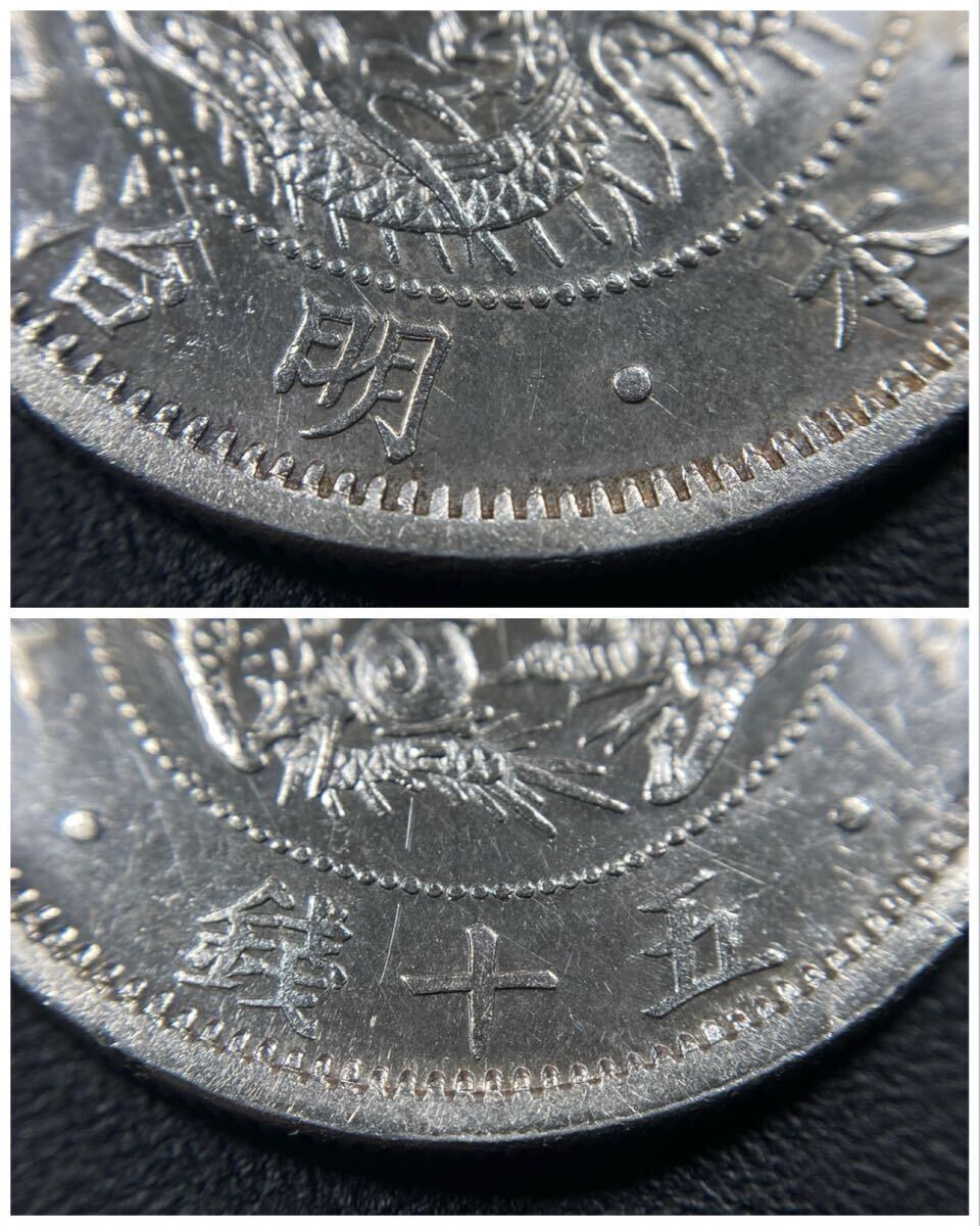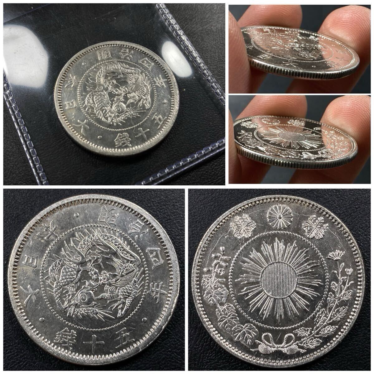こちらは入手時極美品の旭日竜小型50銭銀貨の明治4年で面部平打品になります。