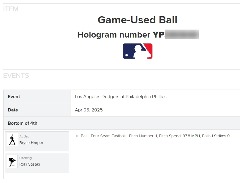 下記のMLB公式サイトのロゴをクリックしてこのボールに付いているMLB機構証明ホログラム番号入力すれば、このボールが2025年4月5日、フィラデルフィア・フィリーズ戦で佐々木投手が4回の裏にHARPER打者に投げた実使用ボールと確認出来ます。投球スピードとピッチの種類もすべて詳細に登録されております。