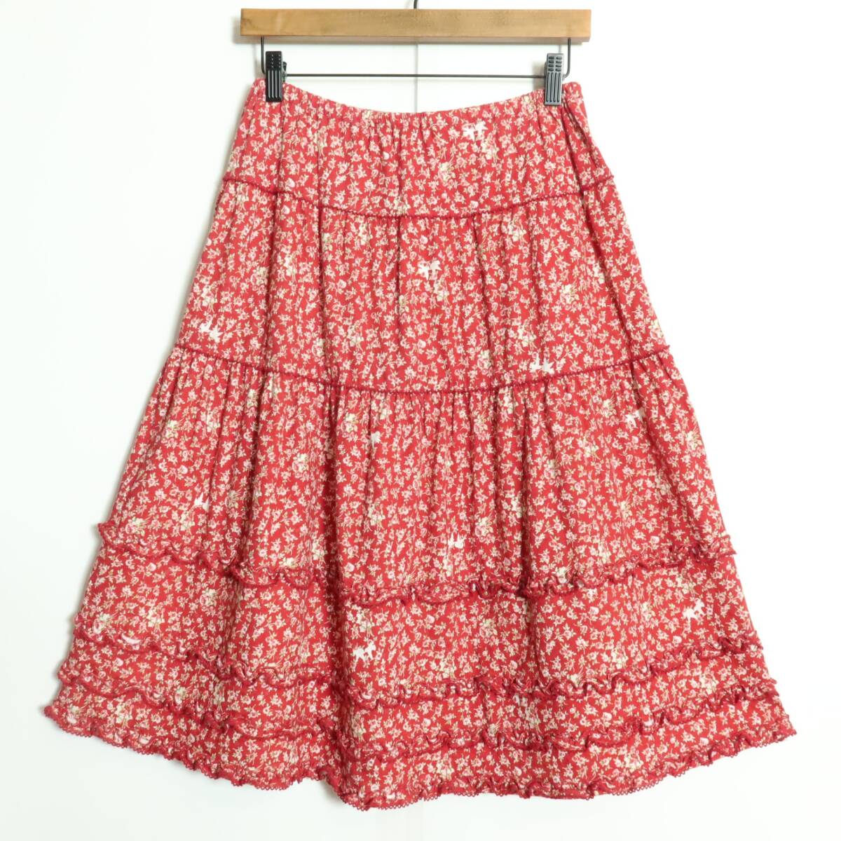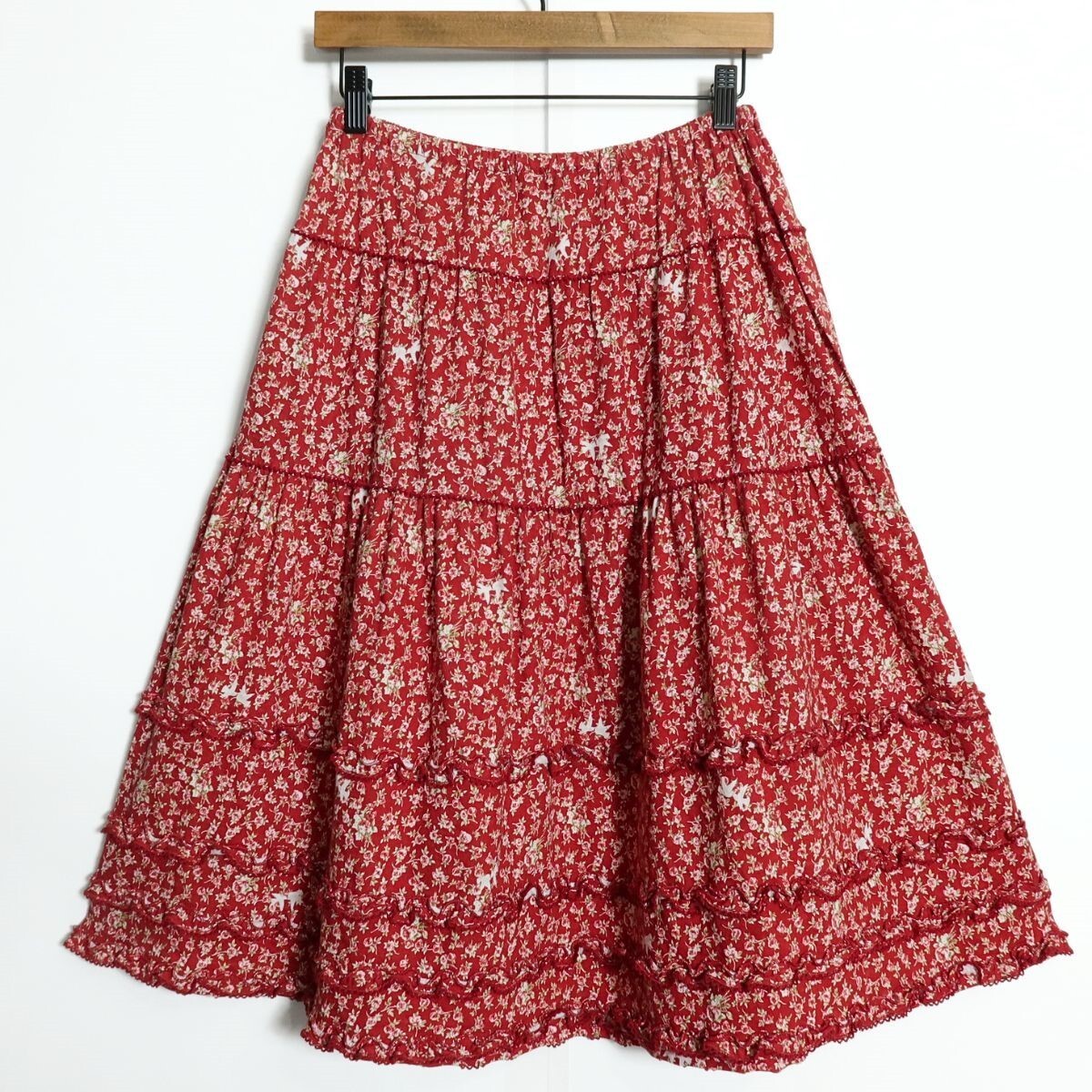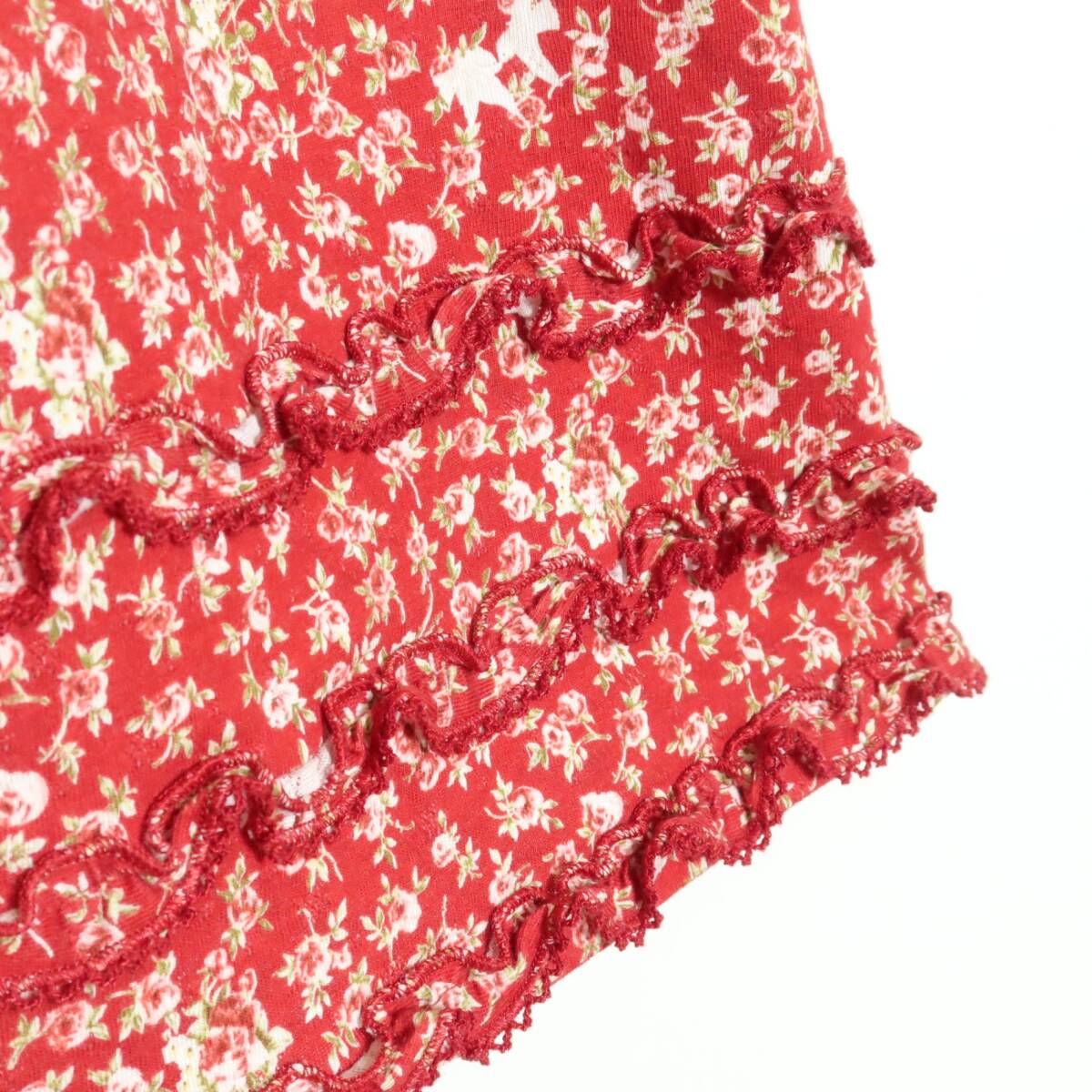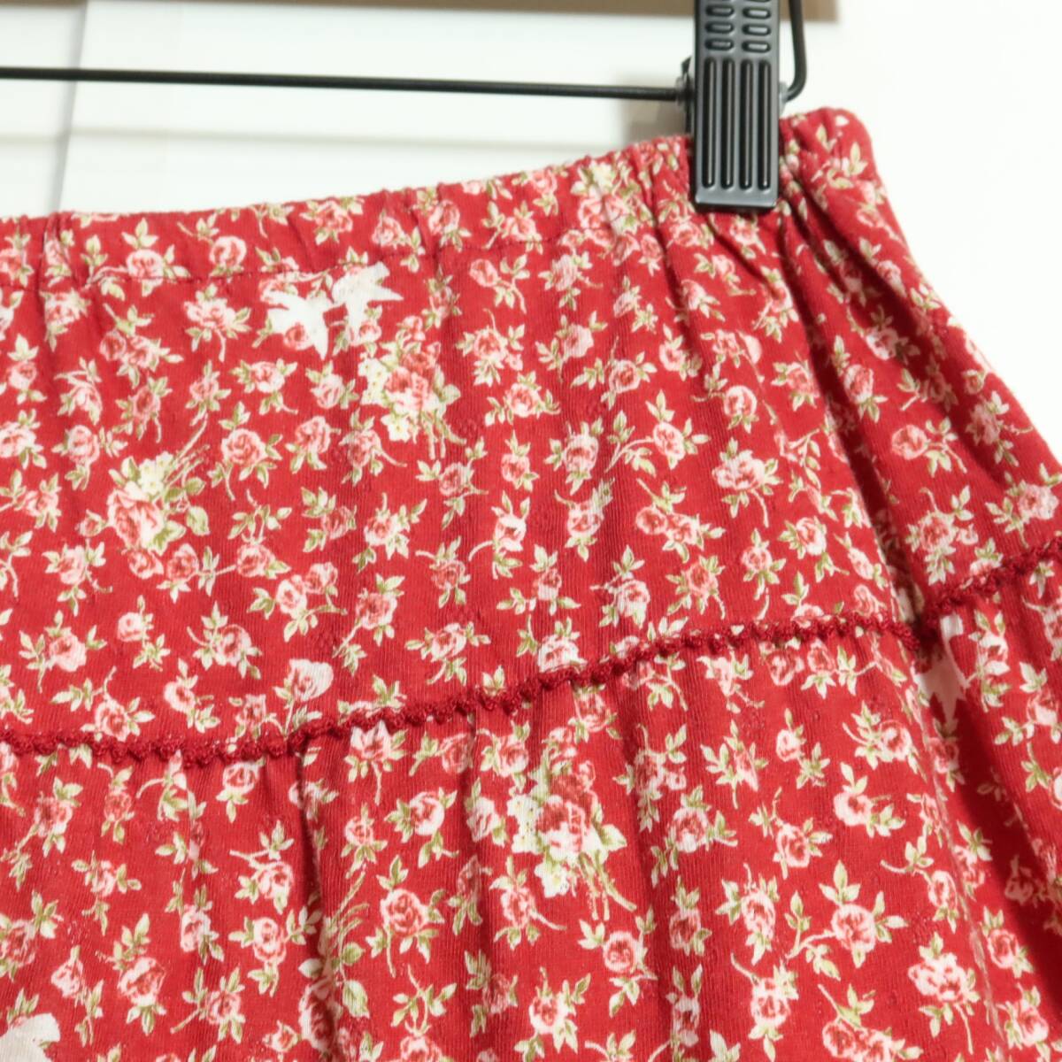 商品説明 | 【実寸約】ウエスト66~丈67(cm) 【サイズ表記】 なし。実寸をご参照くださいませ。 【素材】 綿100% 【状態】普通の使用感のあるお品物 【デザイン】赤系 カットソー素材のティアードギャザースカートです。 薄手/ローズの小花柄・段々フリル&ピコレース付き ポケットあり |