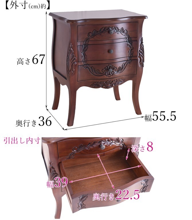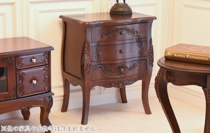商品説明 | Made in INDONESIA 華やかさと無骨さを併せ持つイタリアフィレンツェをイメージして制作しました。 私たちBeBe' Importが送る…近代的なアンティークエレガントインテリア!! 華やか過ぎず…大人し過ぎず…今にしっとりと溶け込む…本物のアンティークエレガント家具。 『メディチ・リッカルディ・フィレンツェ アンティーク家具シリーズ』です。 彫刻が絶品!!お洒落な収納!! 電話台やコンソールとしても。 マホガニー材の木のぬくもりが伝わります。 引出し3杯。アンティーク調の取っ手もお洒落です。 職人によって丁寧に仕上げられた美しいカービング。 ※イメージ写真に一緒に写っている他の家具や小物は商品に含まれません。 【サイズ(cm)約】 幅55.5×奥行き36×高さ67 引出し内寸:幅39×奥行き22.5×深さ8 【材質】 マホガニー天然木(輸出許可マホガニー天然木) 【生産国】 インドネシア 【備考】 ※落札価格に消費税が掛かります。 ※お使いのモニターや照明器具などで、実際の色とは若干異なって見える場合があります。 ※アウトレット商品のため、多少の色ムラ、小キズが見られます。使用には問題ありません。 ※ヤフオク以外でも販売していますので、出品中に在庫が無くなった際は、出品を取り消す事がございます。 |