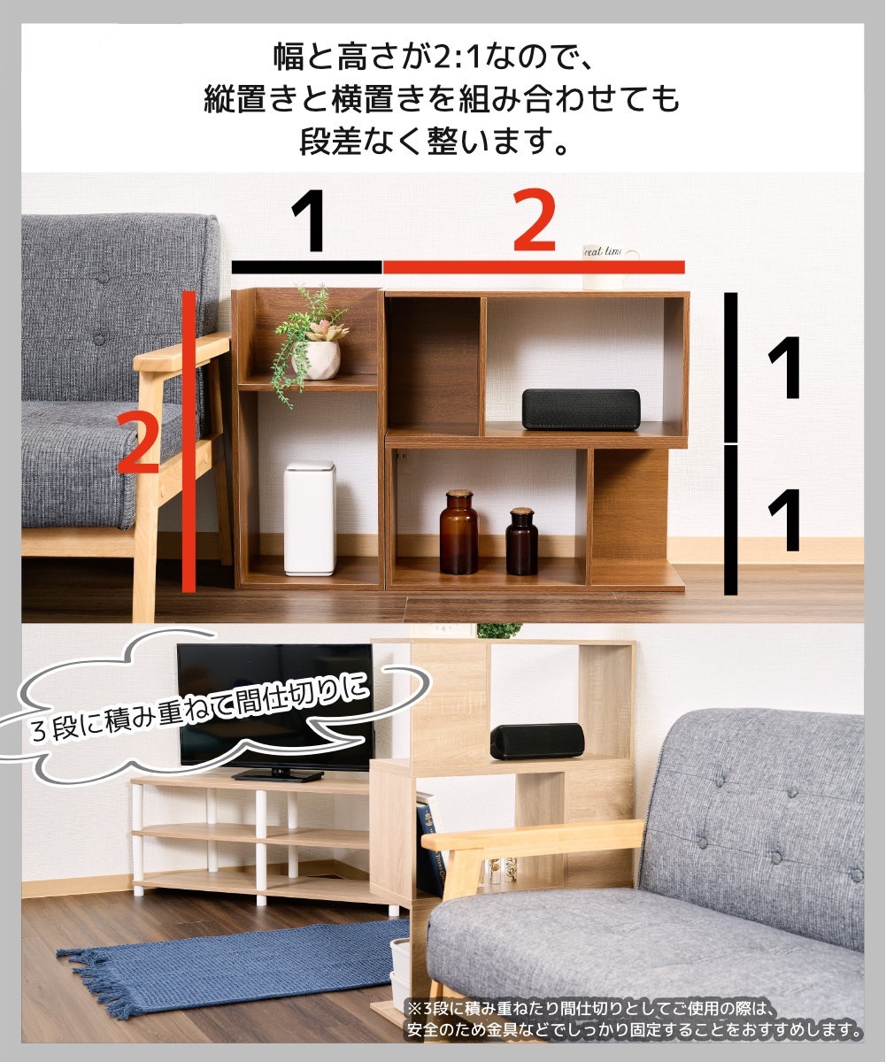 2個横置きすると、縦置きと高さがぴったり揃う設計です。