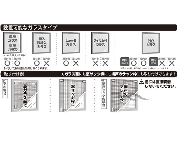 内 容 | ■遮熱で省エネ対策! 紫外線&視線もカット 新MASA クーリアス 2枚組 ■セット内容 ・本体×2、専用両面テープ×30個(5個入りシート×6)、定規(紙製) ■サイズ ・本体:約98×230cm ・専用両面テープ:約3×1.9cm(1個) ■重さ ・本体:約170g(1枚) ■素材・材質・成分 ・本体:ポリエステル100%、 ステンレス(masa加工) ■商品仕様詳細 <設置可能なガラスタイプ> ※外付けの方が遮熱効果は高くなる ・単層ガラス、複層ガラス:屋外側、室内側 ※Low-Eガラス、網入ガラス除く ・網入、鉄線入ガラス:屋外側 ・Low-Eガラス:屋外側 ・凹凸ガラス:屋外側、室内側(網なし・平らな面の場合) ※凹凸ガラス(網なし・凹凸面)は屋外側、室内側とも設置不可ですが、 窓サッシ枠、網戸フレームへの取り付けはできます。 ※網入り・鉄線入ガラス及びLow?Eガラスに 室内側からの使用は、ガラスが熱割れする恐れがあるのでおやめください。 また屋外使用時でもシーズンオフになったら、 ガラスの熱割れ防止のため外してください。 ■日本製 ポリエステルメッシュ生地にステンレスをコーティングした 遮熱効果の高いネットで、付属の専用両面テープを使って 窓やアルミサッシに簡単に取り付けできます。 窓の室内側・屋外側どちらでも取り付けOK。 ※窓ガラスのタイプにより取り付けられない場合もあります。 ナノ粒子のステンレスを糸の表面にコーティングしているため、 繊維の目を潰さず風通しが良いのもポイント。 網戸のサッシ枠に装着すれば、窓を開けて網戸で通気しながら 遮熱効果も得られます。 目隠し効果もあるので、屋外からは室内が見えにくく、 室内からは外がしっかりと見えます。 ハサミでお好みのサイズにカットすることができ、 塵やホコリつきにくく、落ちやすいのもうれしいポイント! ご家庭の洗濯機でネットに入れて洗うことも可能です。 ◆総額 22626円相当 |