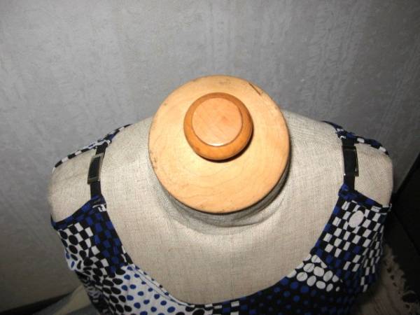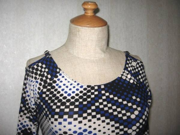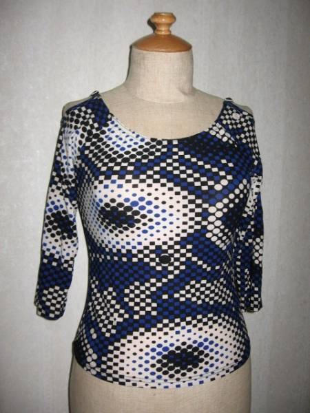 未使用品タグ付。ANAP青黒幾何学柄肩バックル飾り7部袖カット