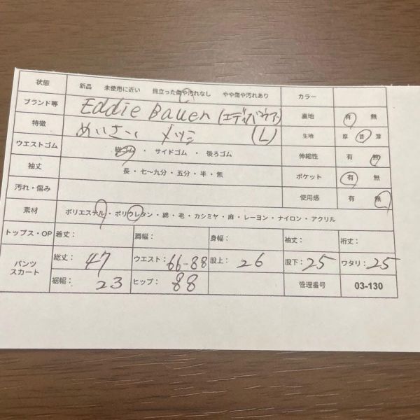 アクティブシーンに最適◎ Eddie Bauer メッシュ裏地付きカモ柄ショートパンツ - ブランド:Eddie Bauer(エディーバウアー) - サイズ表記:L - 素材:表地 ポリエステル90%、スパンデックス10%/裏地 ポリエステル100% - カラー:ブラック系カモフラージュ - シーズン:春夏 - 服の特徴:総ゴムウエスト、ドローコード付き、両サイドポケットあり、メッシュ裏地 管理番号: 03-130 即購入大歓迎・お得な割引各種あります 詳しくはプロフィールをご覧ください! 匿名&送料無料 海外輸入のため全て一点ものです 古着のため使用感・毛玉等があることもあります。写真で状態の確認を行なってからご購入ください おまとめ買いでお得な割引あります♪ 平置き採寸表→写真から確認いただけます! (素人採寸のため、多少の誤差はご了承ください) 商品状態に関しては、写真、商品説明欄に記載しております。着用回数、購入時期などはお答えできませんので、ご了承ください。着画、写真の追加もお断りしております。 簡易包装のコンパクト発送となります。 畳みシワはご了承の程、宜しくお願いいたします。 商品によっては圧縮してお送りするものもございます。 撮影環境や使用するモニター、反映されにくい色味など、 商品と画像に若干の色誤差が生じますことをご了承ください。 出品作業の際にしっかりと確認はしておりますが、シミなどの見落としがある場合もございますのでご了承下さい。 古着の取り扱いになりますので特有の匂い等がある可能性があります。ご理解のある方のみご購入の程お願い致します。