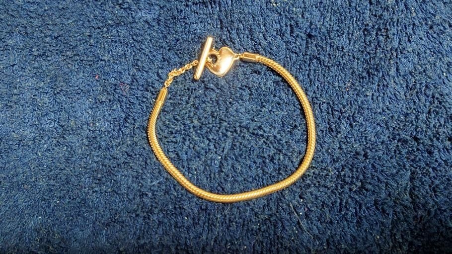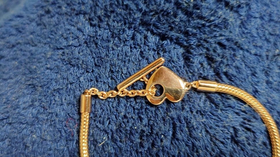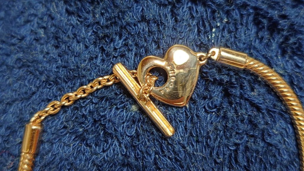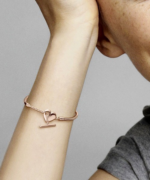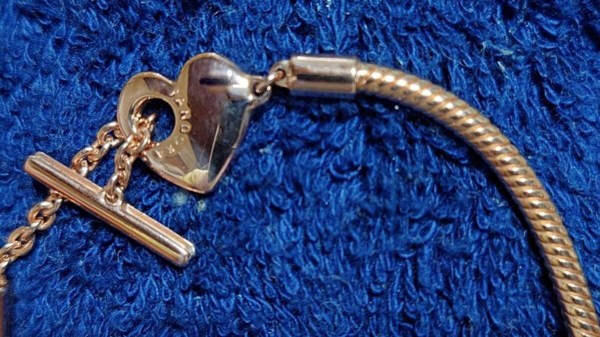 デザイン・・・・Tバーでハートの中にTの棒をハートに入れてブレスレットを外せるのでパンドラのチャームを沢山入れれつけれます。14金貼りで同じシリーズのシルバー製より重いです。本体素材はシルバー925製の高級モデル。