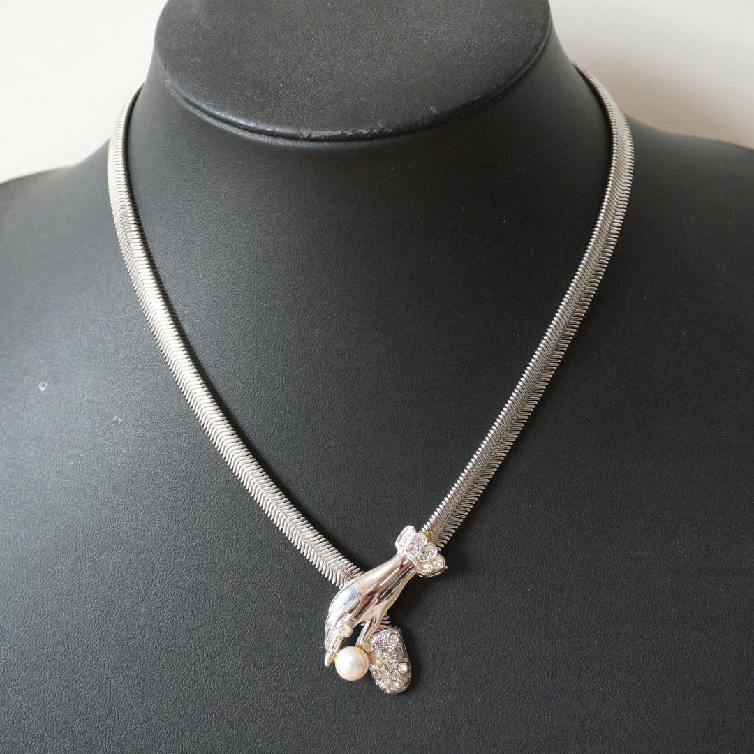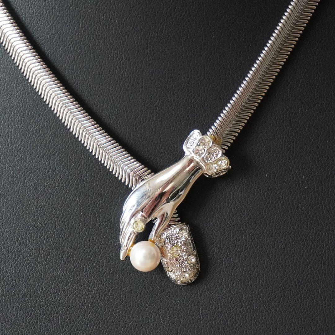 繊細な手元のモチーフが印象的な、エレガントなデザインのネックレスです。