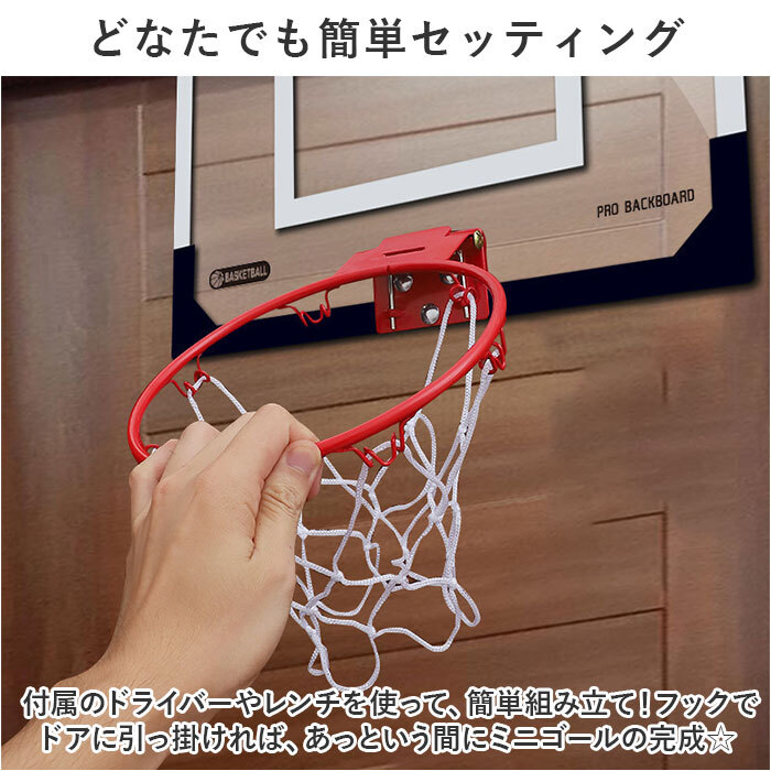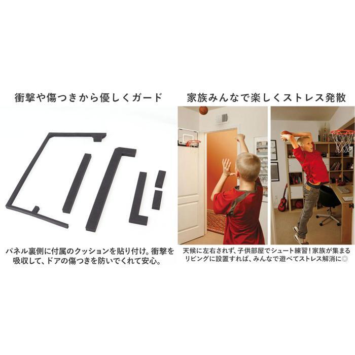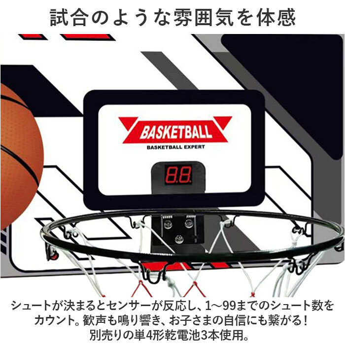 商品説明 | ・・お部屋のドアに引っ掛けて使える!自宅でも手軽にシュート練習できる、バスケットゴールセットが登場。 ・【どなたでも簡単セッティング】 ・付属のドライバーやレンチを使って、簡単組み立て!フックでドアに引っ掛ければ、あっという間にミニゴールの完成☆ ・【試合のような雰囲気を体感】 ・シュートが決まるとセンサーが反応し、1~99までのシュート数をカウント。歓声も鳴り響き、お子さまの自信にも繋がる!別売りの単4形乾電池3本使用。 ・【お子さまも持ちやすいミニボール】 ・付属の空気入れで膨らますボールは、柔らかな素材&ミニサイズ。小さなお子さまも持ちやすく、当たってもケガの心配が不要。 ・【衝撃や傷つきから優しくガード】 ・パネル裏側に付属のクッションを貼り付け。衝撃を吸収して、ドアの傷つきを防いでくれて安心。 ・【家族みんなで楽しくストレス発散】 ・天候に左右されず、子供部屋でシュート練習!家族が集まるリビングに設置すれば、みんなで遊べてストレス解消に◎ |