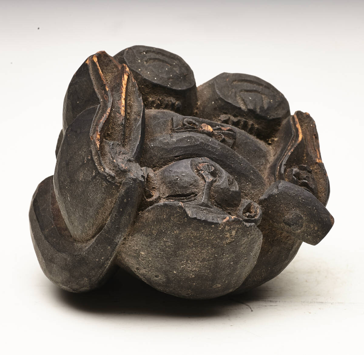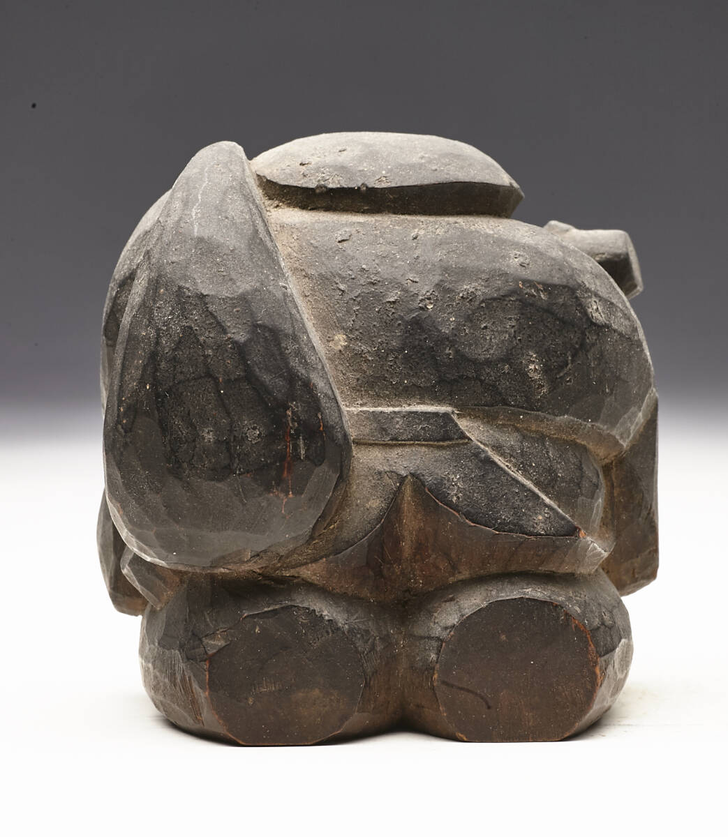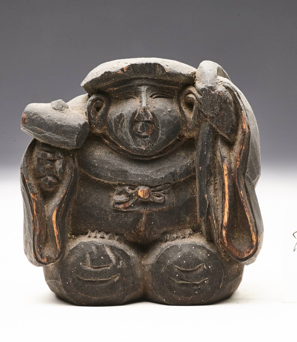 あわただしさが日増しに募る現代、私たちの心を落ち着かせてくれるのは、時の流れに左右されない者たちです。それは、人生で一番大切なものは、何かを私たちに気づかせてくれるものたちです。恵比寿大黒様は、室町中期に福の神として親しまれるようになりましたが、江戸時代になると庶民の願いごとも多くなり、どの家も家の内をひっそりと見守るように祀られました。貧しくて笑うことの少ない日々の暮らしの中で、精一杯微笑みを忘れないという日本人特有の性格は、この時に微笑の造形佛の造形と共に育まれてきたものと思われます。近代となっても恵比寿大黒さま、庶民の商いや事業を成功させる願いを叶えます。たとえば、馬越恭平という人物は、ビールなる飲み物を日本中に普及する事業に取り組みいまにみるように楽しい空間を作ることに情熱を捧げました。また御木本幸吉という人物は、世界中の女性の首をしめて貴婦人に変えてしまう事業を興し成功させました。ご両人とも、のちに富豪と呼ばれましたが、実は、恵比寿大黒様の信望者で、その熱心なコレクターとなって、長寿の生涯を過ごされたことは、もっと知られていてもいいでしょう。その恵比寿大黒様が、幾多の地震や大火をくぐり抜けて今ここに姿かたちを現した強運のものたちです。長い年月へっついの湯気と煤にまみれて古色経年を帯び黒光りする様は、恵比寿大黒様にこそ許されるものです。この個性豊かな表情で、笑みを湛え穏やかなパワーを放つお姿をぜひ評価していただければ、幸いです。この作品は、造形作家の60年におよぶ個人コレクションからの出品となります。恵比寿大黒様は【日本の民族彫刻】としての造形に相当すると考えます。