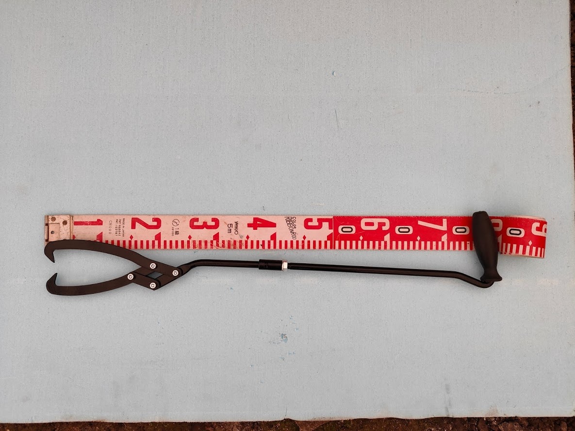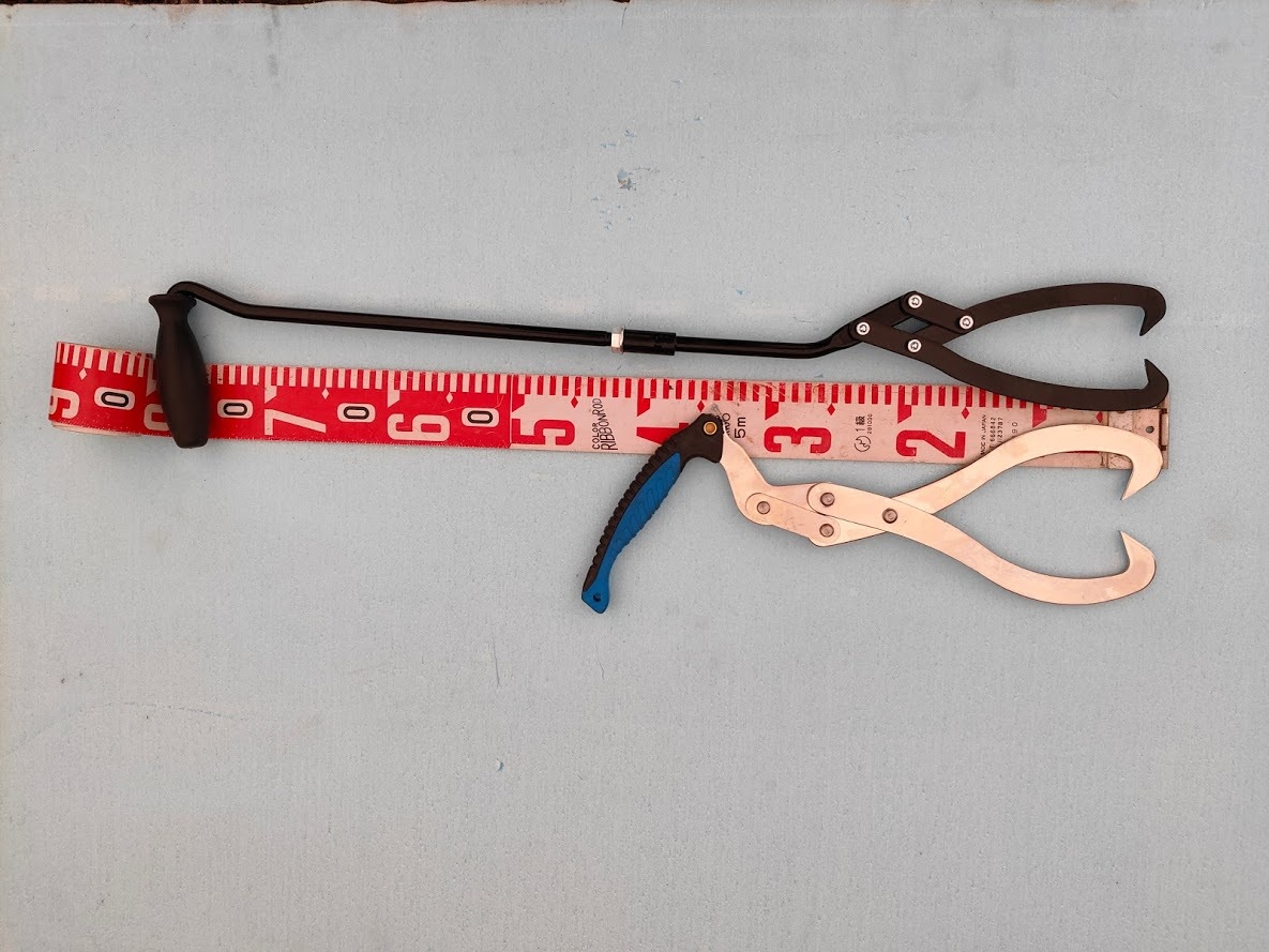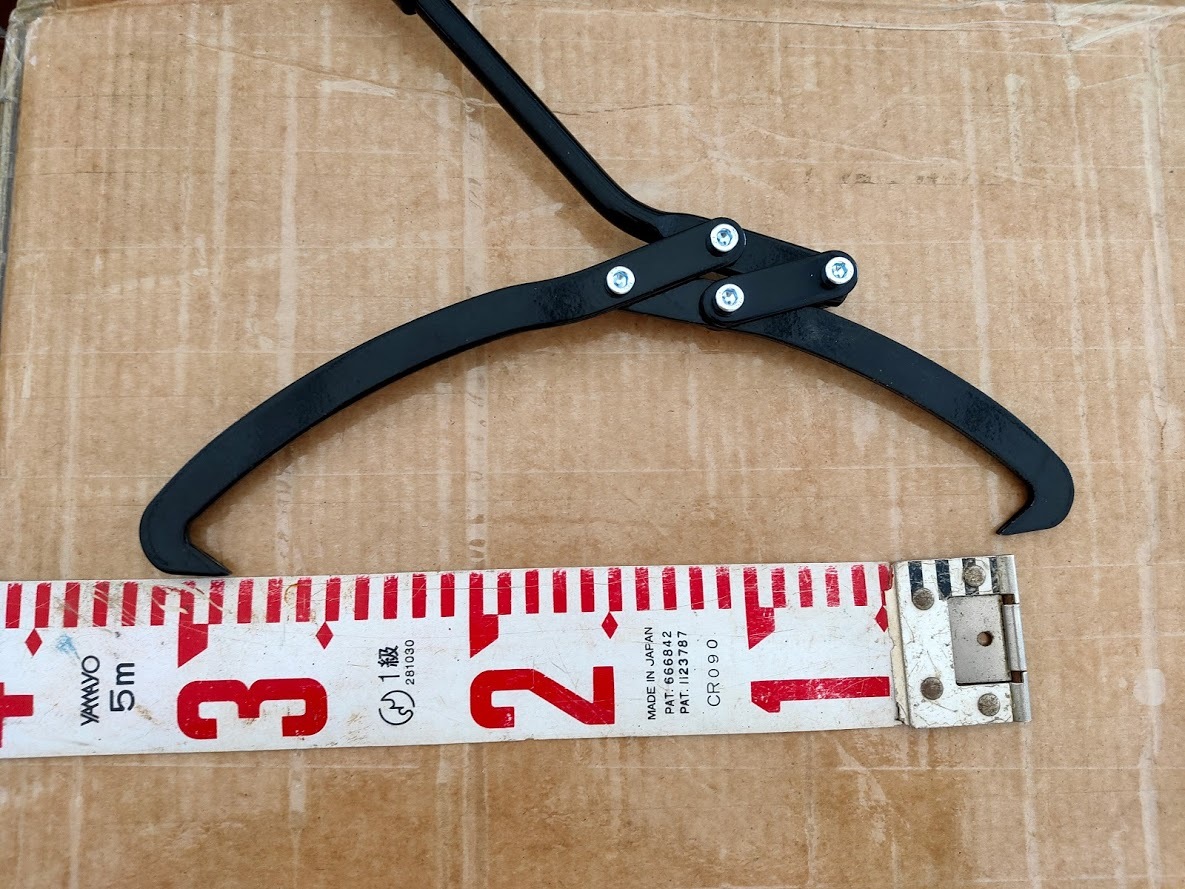 | 商品の色は黒になります。 丸太をはさんで持ち上げたり、引きずって移動するための道具で、丸太を直接手で持つよりも便利です。 玉切した原木の集材、流木や廃木材の撤去など林業道具の中で便利だと評価されています。 はさむフックの大きさはハスクバーナの20cm(8インチ)トングと同じくらいです。比較のために写真で隣に写っているのは別売りの30cmトングです。 重さ約1,1kg、最大開口約25cm。 ●丸太の小口(切口)をつかむ場合の丸太の最大直径は約20cm、 ●丸太の側面(曲面)をつかむ場合の丸太の最大直径は約15cmです。 薪で一般的なナラの木やクヌギの木などの粗い樹皮の木は満足につかめるよう設計されておりますが、純正の刃は安全のためさほど鋭くありませんので平滑な樹皮はつかみづらいです。 刃を鋭くすれば平滑な樹皮の丸太もつかめるようになりますが、刃でケガをしないよう研磨は自己責任でお願いします。 本体シャフト真中で2分割になっており、ボルトとナットで任意の角度で固定します。また、フック側のボルトとロックナットのガタと動きやすさを調整してください。 |