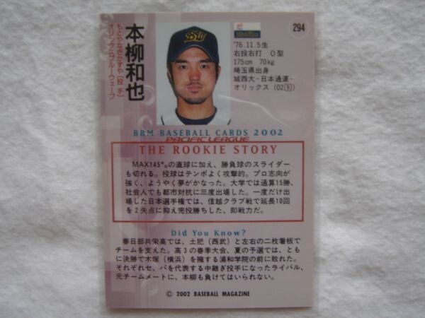 【BBM プロ野球カード 2002】No.294 本柳和也 オリックスブルーウェーブ【トレーディングカード トレカ ベースボールマガジン社 ルーキー】