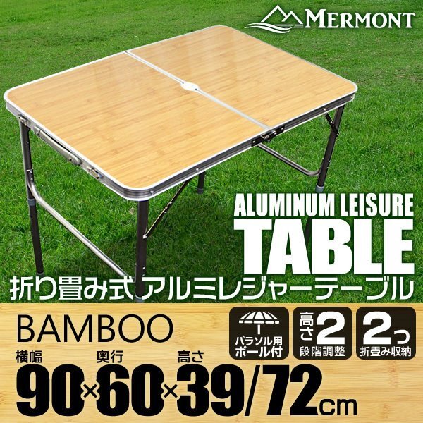 MERMONT - メルモント - アルミレジャーテーブル 折りたたみ収納式 耐熱・耐水加工 パラソル用ホール付き |
