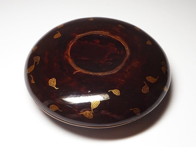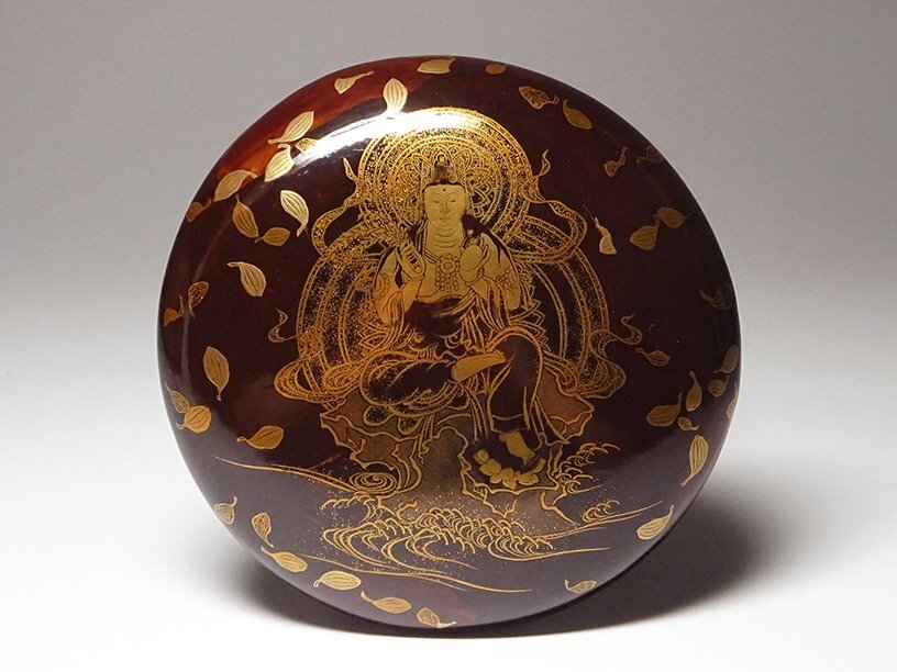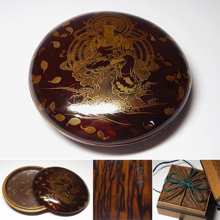 本物保証!         江戸時代に制作された、観音蒔絵の御香合です。       精緻な本金研出蒔絵で荘厳な観音半跏像が表現された作品で、まわりには蓮葉が散らされております。   内にも銀溜地に蓮葉散らし蒔絵が施されます。     塗り直し痕や底部の床擦れが時代経過を感じさせる時代漆芸の優品です。       銀泥題字書きがされた黒柿製旧蔵箱、二重箱仕立て。(黒柿箱の底ワレ傷みあり)   仕服付き。(経年による多少の切れ傷みあり)         古作漆芸故の多少の塗り直し痕等見られますが、現状で目立つような傷み無く良好な状態といえます。          正真正銘本物保証!
