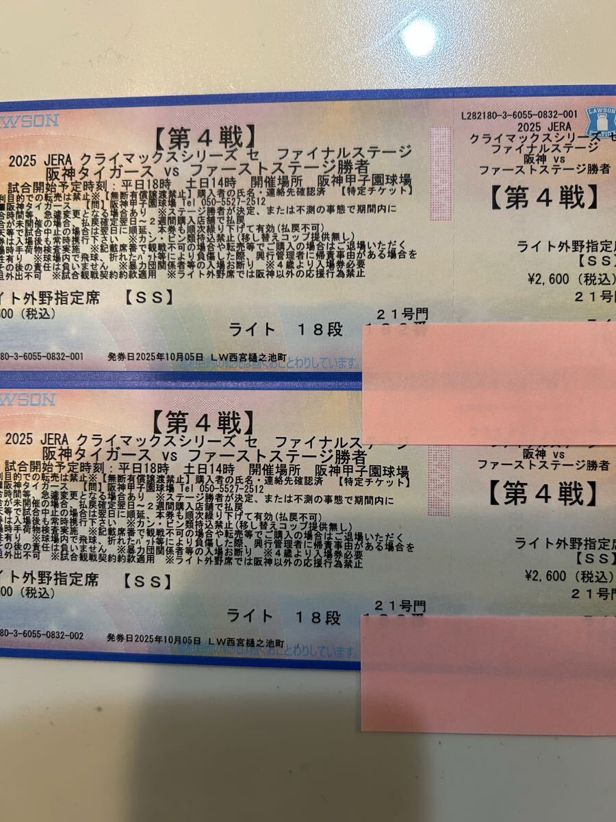 甲子園球場、クライマックスシリーズファイナルステージ第4戦。ライトスタンド18段通路側から2席ペア。送料無料。試合が行われない場合には5200円をコンビニで返金を受ける形になります。それ以上の返金は対応はできません。