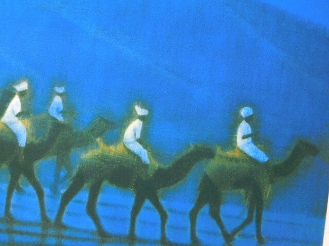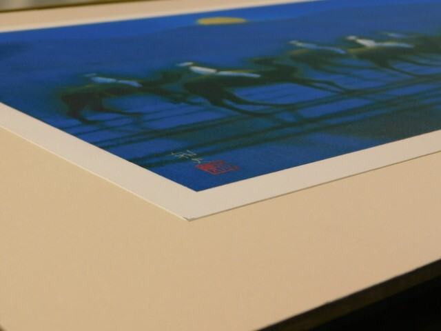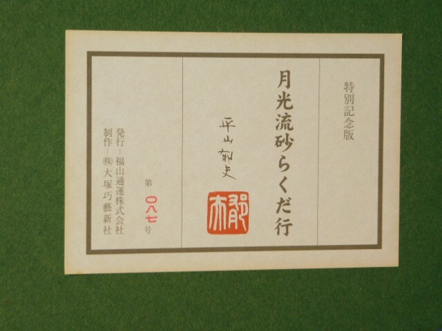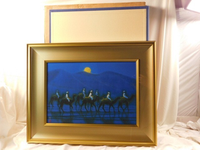 ★タトウ箱に入っていて中身も私的には綺麗なタイプだと思います ★箱に記載;〇山郁夫筆 〇光流砂らくだ行 087 (上の部分の剥がれで見えなくなっています) ★額の裏に記載の紙が貼ってあります(特別記念版 月光流砂らくだ行 平山郁夫 第〇八七号 発行 福山通運株式会社 制作 大塚工藝新社