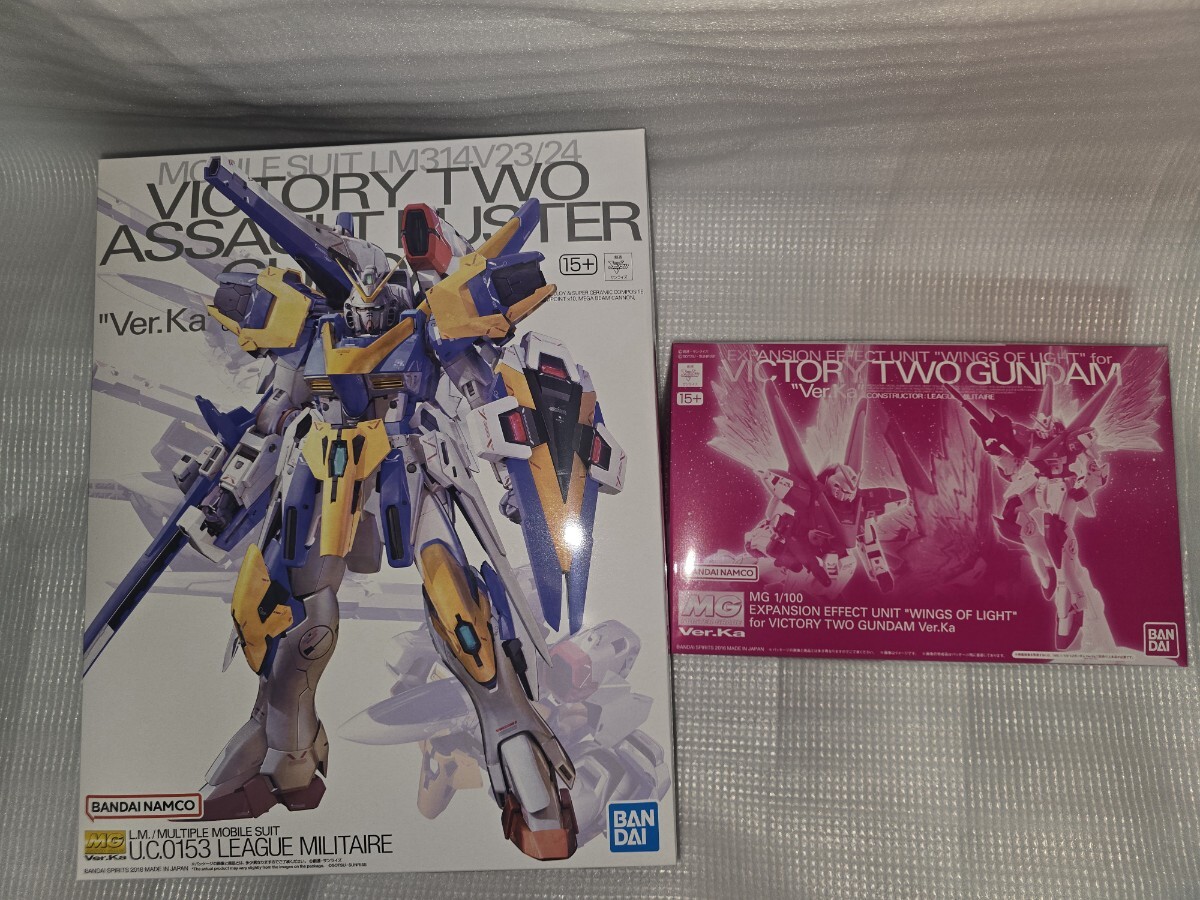 、プレミアムバンダイで購入したMG V2アサルトバスターガンダム Ver.KaとMG 1/100 V2ガンダム Ver.Ka用 拡張エフェクトユニット “光の翼” になります。新品未開封になります。整理のために出品します。目立つようなキズやへこみは見られません。画像をご確認ください。