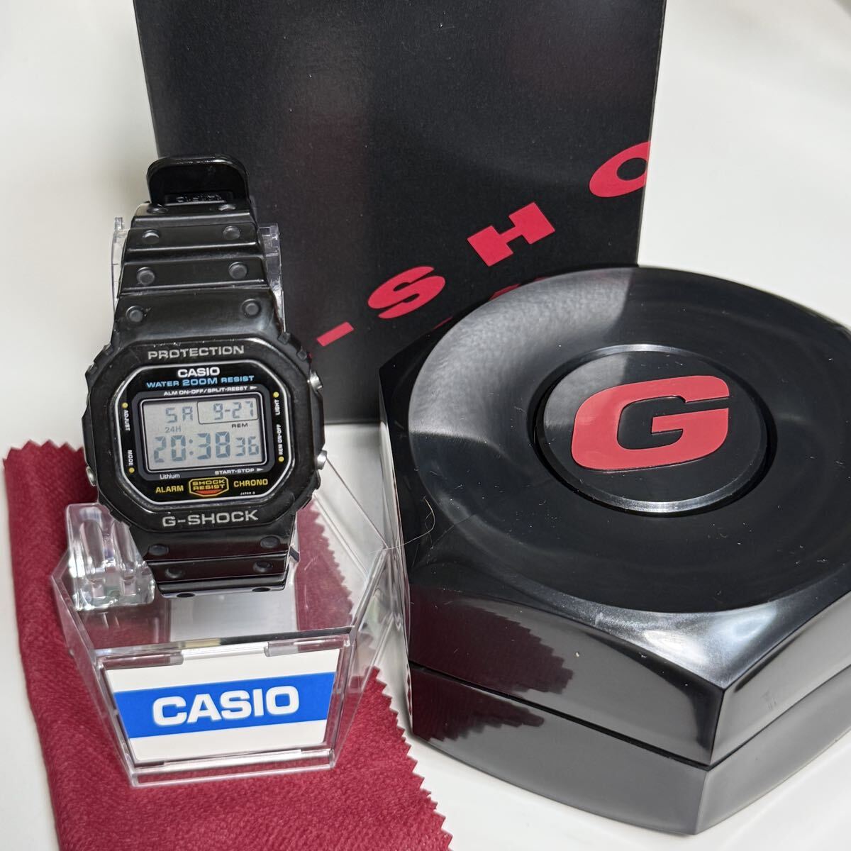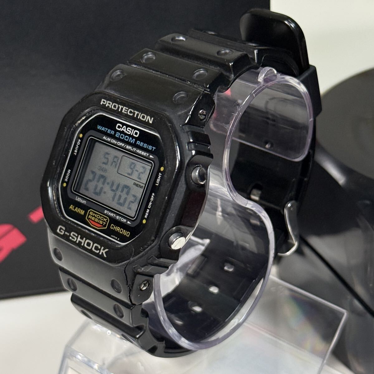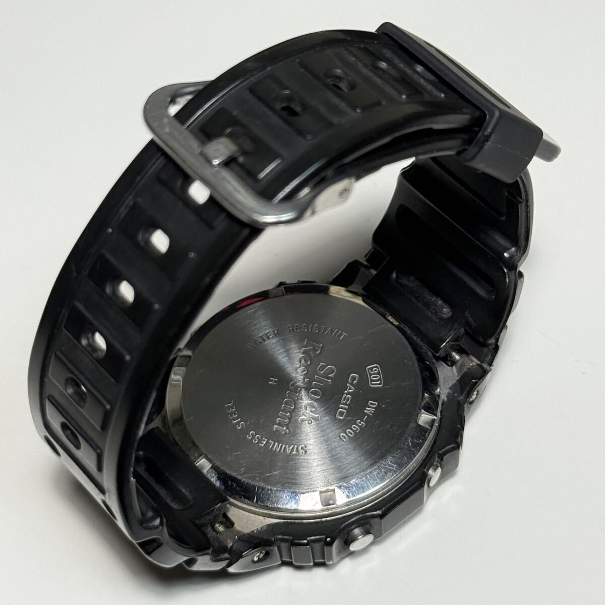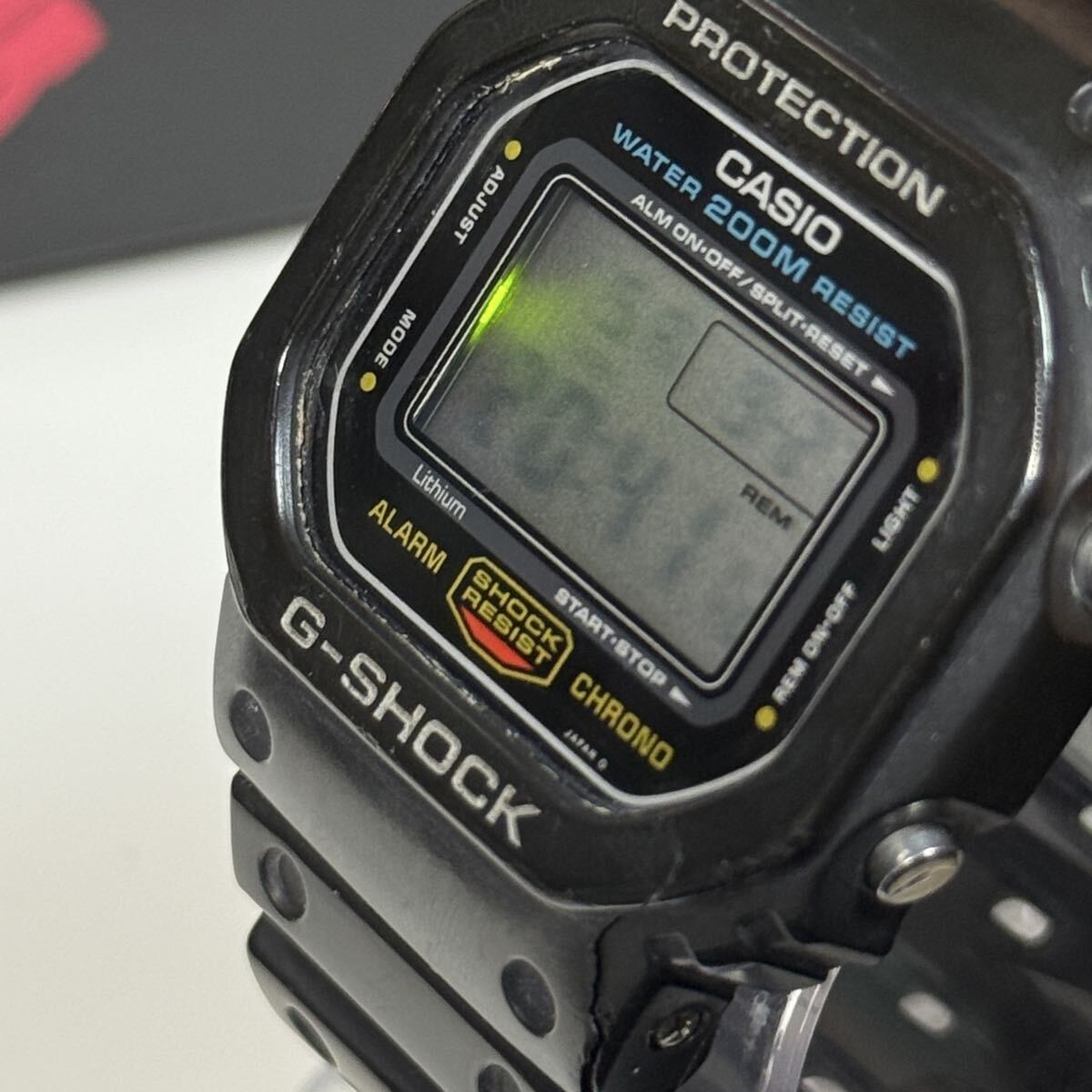 G-SHOCKのDW-5600C-1です。言わずと知れたG-SHOCKの代表モデルでスピードモデルとして愛され続けています。こちらの個体はモジュール901のグリーン豆球です。数年前にコレクションとして購入しましたがこちらのモデルの所持数が10本以上あるため出品いたします。ベゼルは購入時の物のままでCASIO純正オリジナルです。加水分解によるヒビがありますがベタつきは無く形状はしっかり保たれています。ベゼル固定ネジは4本とも正常に取り外しできます。モジュール本体は傷もなくとても綺麗です。こちらのモデルは大変貴重でG-SHOCK好きなら誰もが1本はコレクションしたいモデルかと思います。オリジナルのパーツが揃っているのでこのままビンテージG-SHOCKのコレクションとして展示するのも良いかと思います。付属品は当時の箱とケースになります。非喫煙環境、非ペット環境なのでにおいや汚れの心配はありません。ビンテージ時計でとてもデリケートなため購入後の分解やパーツ交換等は自己責任でお願い致します。商品の特性上すり替え防止等のためいかなる理由があっても返品や返金対応は対応しかねますので気になる点は購入前にご質問下さい。