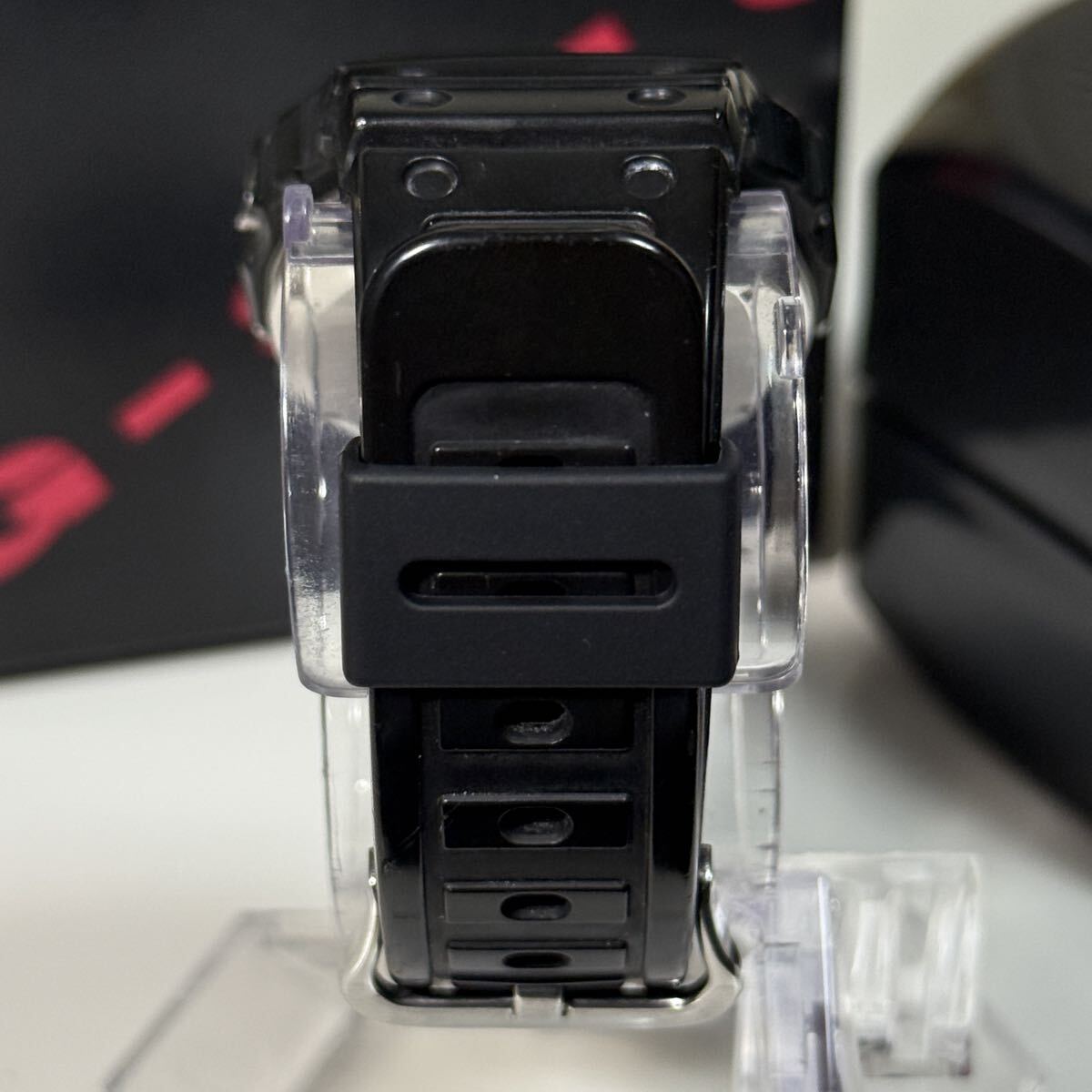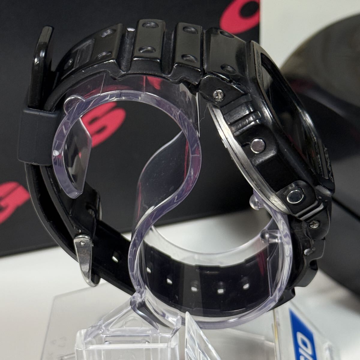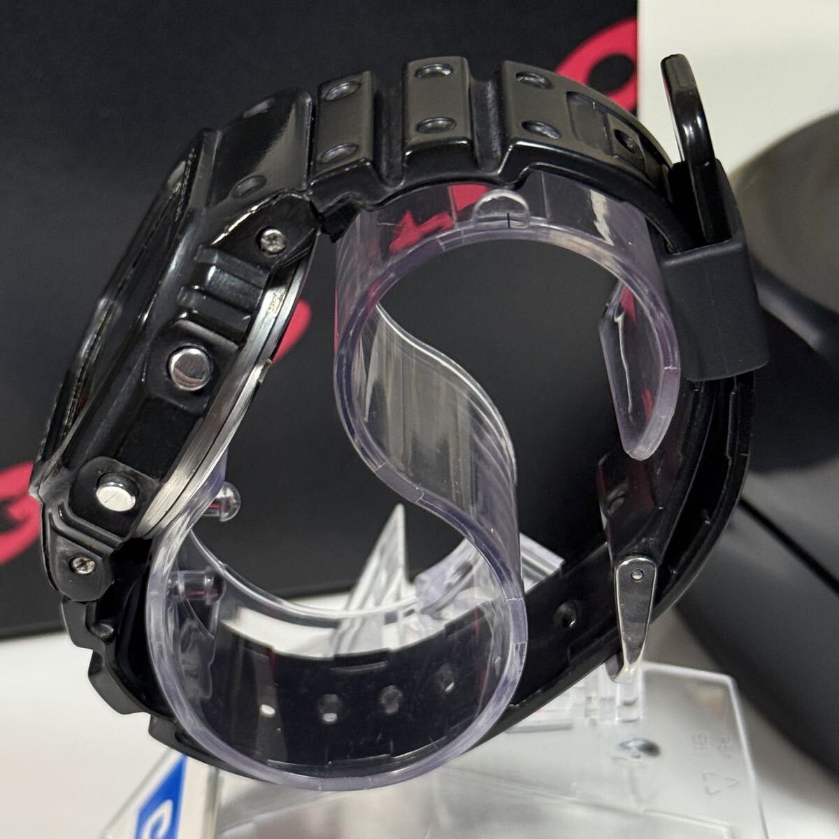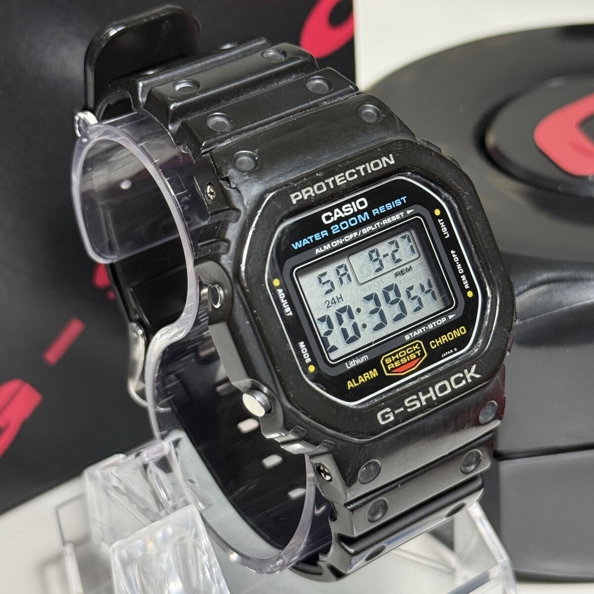 G-SHOCKのDW-5600C-1です。言わずと知れたG-SHOCKの代表モデルでスピードモデルとして愛され続けています。こちらの個体はモジュール901のグリーン豆球です。数年前にコレクションとして購入しましたがこちらのモデルの所持数が10本以上あるため出品いたします。ベゼルは購入時の物のままでCASIO純正オリジナルです。加水分解によるヒビがありますがベタつきは無く形状はしっかり保たれています。ベゼル固定ネジは4本とも正常に取り外しできます。モジュール本体は傷もなくとても綺麗です。こちらのモデルは大変貴重でG-SHOCK好きなら誰もが1本はコレクションしたいモデルかと思います。オリジナルのパーツが揃っているのでこのままビンテージG-SHOCKのコレクションとして展示するのも良いかと思います。付属品は当時の箱とケースになります。非喫煙環境、非ペット環境なのでにおいや汚れの心配はありません。ビンテージ時計でとてもデリケートなため購入後の分解やパーツ交換等は自己責任でお願い致します。商品の特性上すり替え防止等のためいかなる理由があっても返品や返金対応は対応しかねますので気になる点は購入前にご質問下さい。