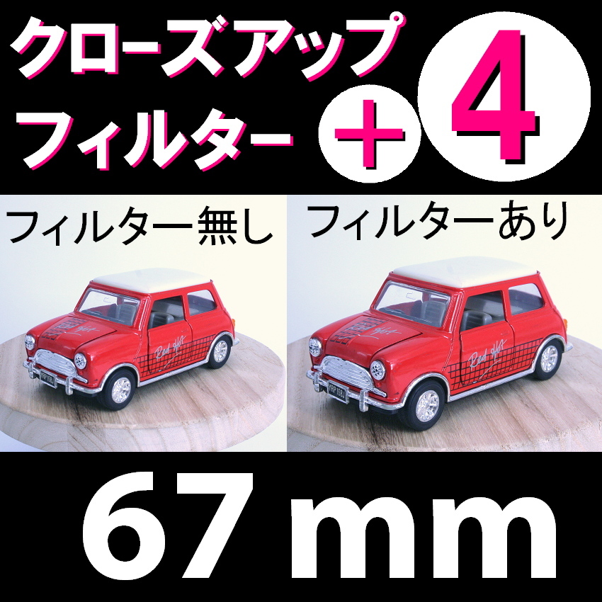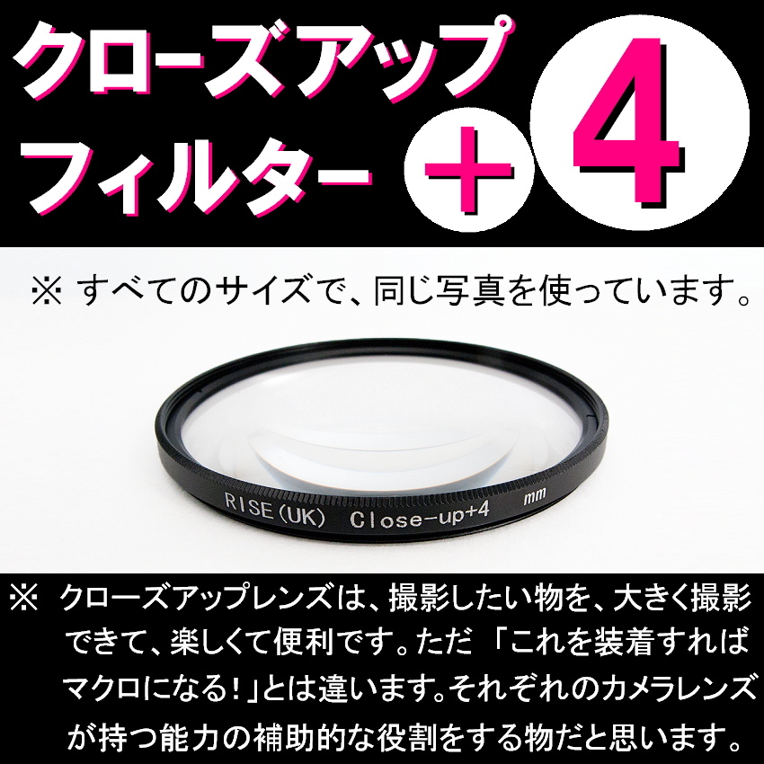 ● マクロ風に大きく撮影したい時に、この「クローズアップ フィルター」があると景色や物を大きくして撮影できます。※ 専用ケースや箱は、ありませんが丁寧に梱包いたします。※ ミニカーは出品物ではありません。 ● まずは「最短撮影距離」が影響して思った通り撮影できないので、まずは +2 または +4くらいから始めると良いかもしれません。お散歩や、室内でテスト撮影してレンズの「最短撮影距離」など楽しく学ぶと、良いと思います。 ● クローズアップ フィルターは【+4】、フィルター径で 37 / 40.5 / 43 / 46 / 49 / 52 / 55 / 58 / 62 / 67 / 72 / 77 / 82mm のサイズが、ございます。(39mmは、ございません。) ● どのカメラメーカーの、カメラレンズにも、フィルター径のサイズが合えば取り付けできますので安心してご検討くださいませ。 → クローズアップ フィルター 【 +1 】 ← → クローズアップ フィルター 【 +2 】 ← → クローズアップ フィルター 【 +4 】 ← → クローズアップ フィルター 【 +8 】 ← → クローズアップ フィルター 【 +10 】 ← ※ 写真は同じものを、使っています。デザインの一部に変更がある場合がございます。あらかじめ、ご了承ください。商品に不安のある方、神経質な方は、ご遠慮ください。 | ||