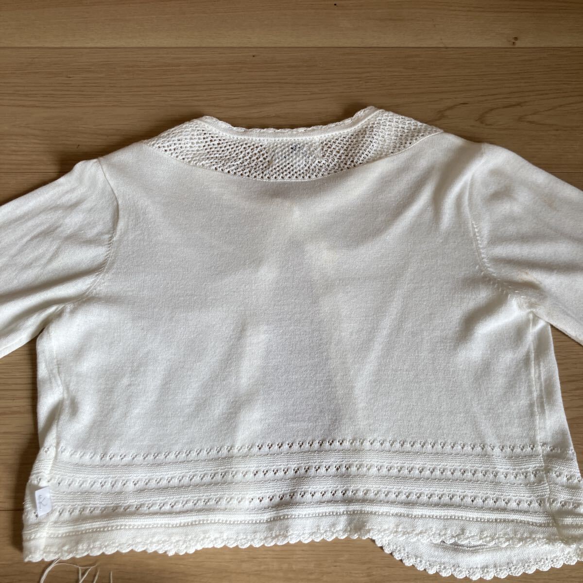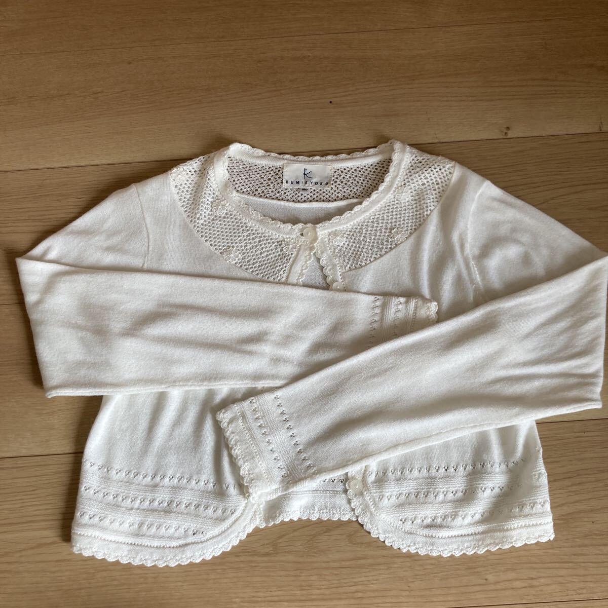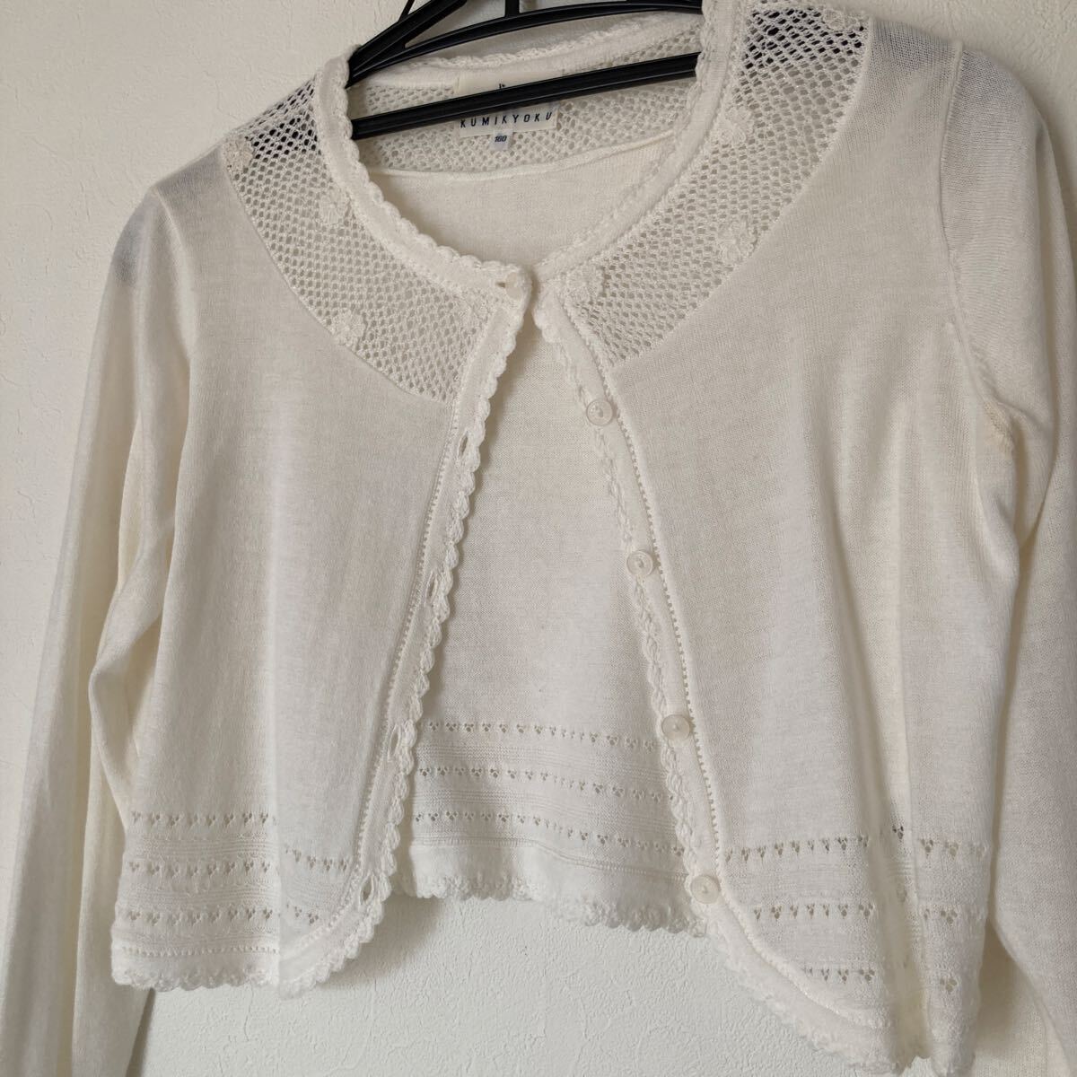 組曲の白のニットカーディガンです。数年前購入し発表会で着用しました。着丈38㎝アクリル57%、綿42%、ポリエステル1%。後ろ右袖に薄く汚れがありました。他はキレイな状態だと思います