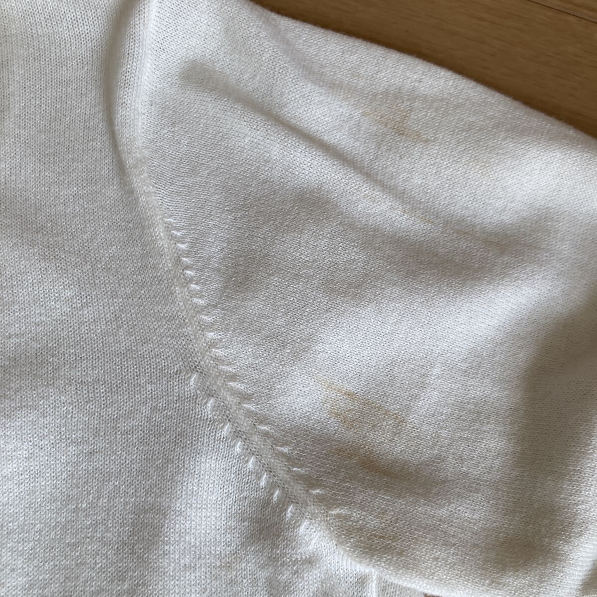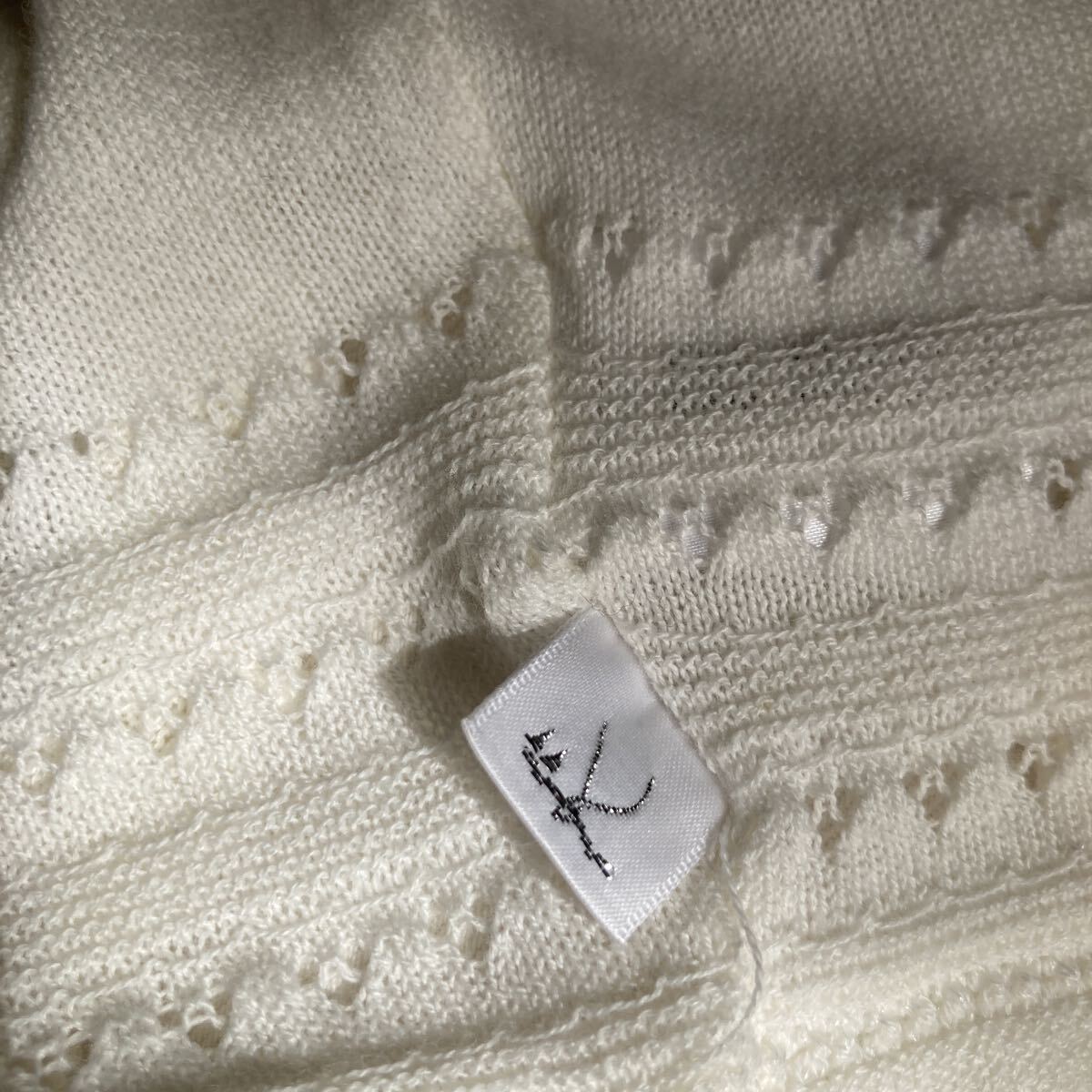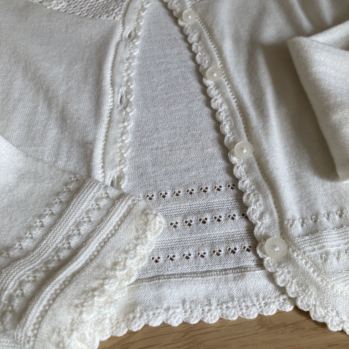 組曲の白のニットカーディガンです。数年前購入し発表会で着用しました。着丈38㎝アクリル57%、綿42%、ポリエステル1%。後ろ右袖に薄く汚れがありました。他はキレイな状態だと思います