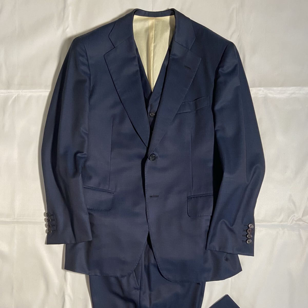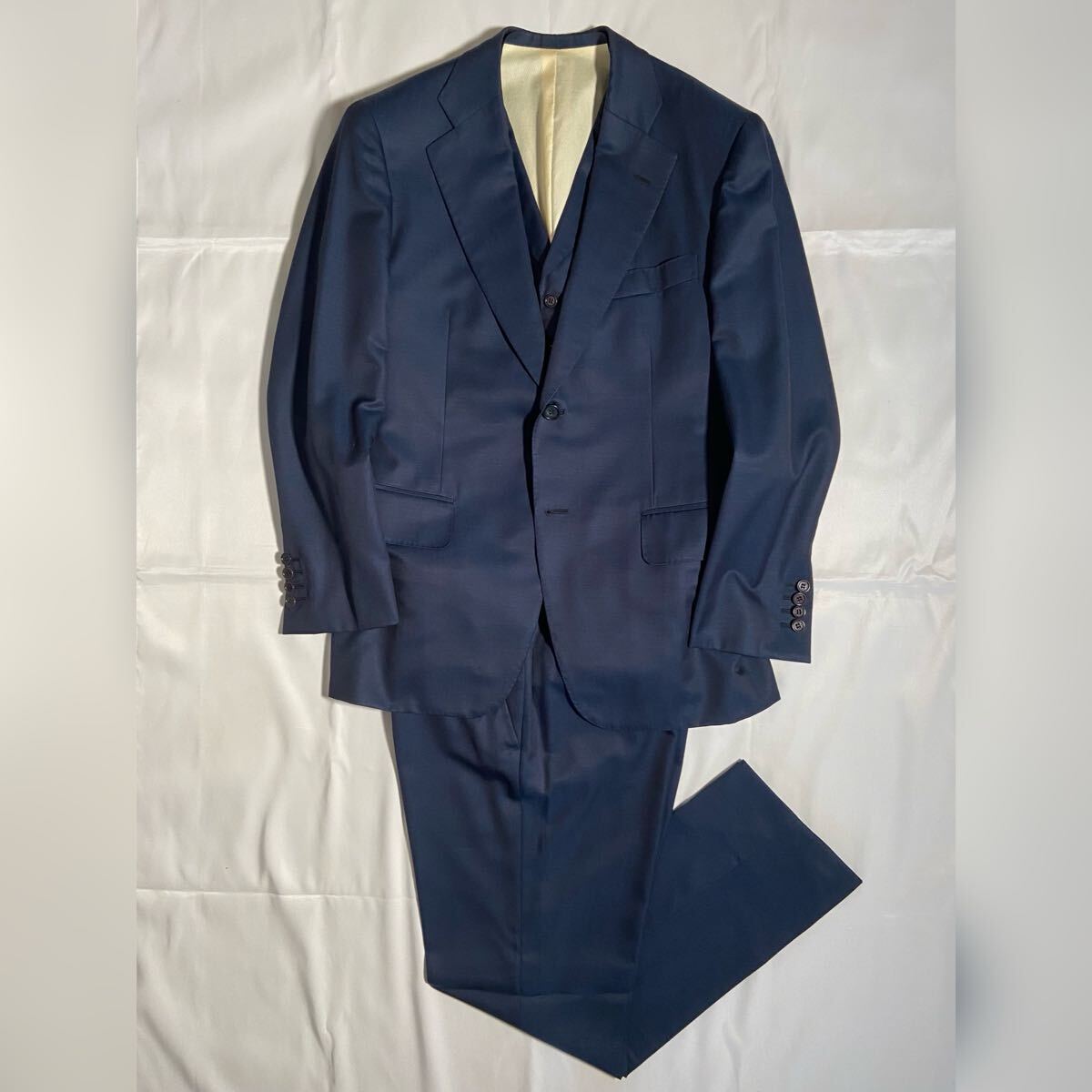過去、国内老舗テーラー勤務中に英国王室にもスーツ納品経験のある職人廣川氏が型紙から縫製までフルハンド(丸縫い)で仕上げた超高級スリーピーススーツです。かなり貴重な一点物なのでぜひご覧ください。