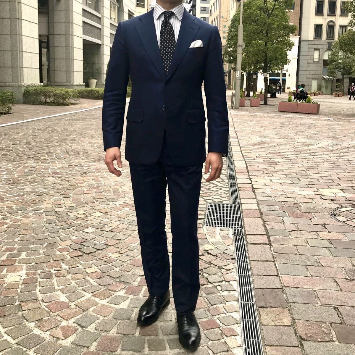 仕立ては本バス毛芯・総毛芯仕立て・本セッパ・ビルドアップショルダー・オールハンドステッチ・前肩仕様・サイドベンツなど高級スーツの条件的な部分とデザイン性を網羅し、マニアが好む内容になっています。なお接着を一切使わず縫いだけで仕上げたスーツです。