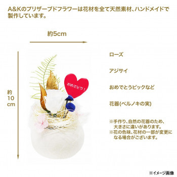 | お手入れなしで美しい状態を保つことができる、ローズを使ったプリザーブドフラワーです。おめでとうピック付きなので、お祝いの贈り物におすすめです。花器はベルノキの実をくりぬいてつくりました。 ※手作りのため、大きさに違いがあります。 ※花器は果実をそのまま使用しているので、大きさは不揃いです。 ※花の色味、花材の一部が変更になる場合がございます。 |
