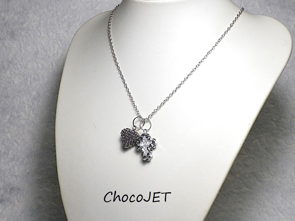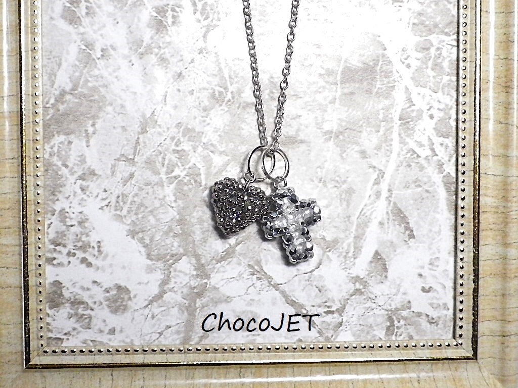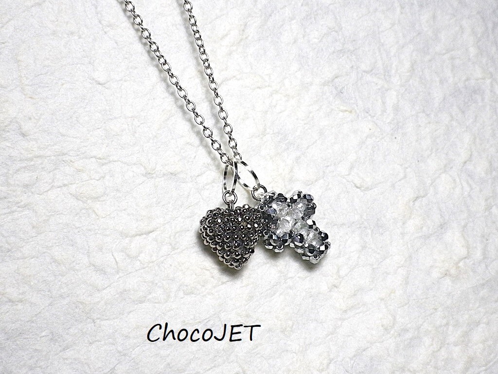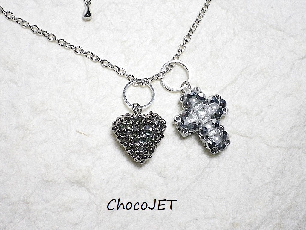 チェコビーズのミニ・クロスとカットシードビーズのミニ・ハートモチーフネックレスです。
