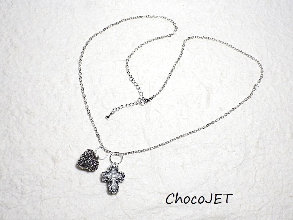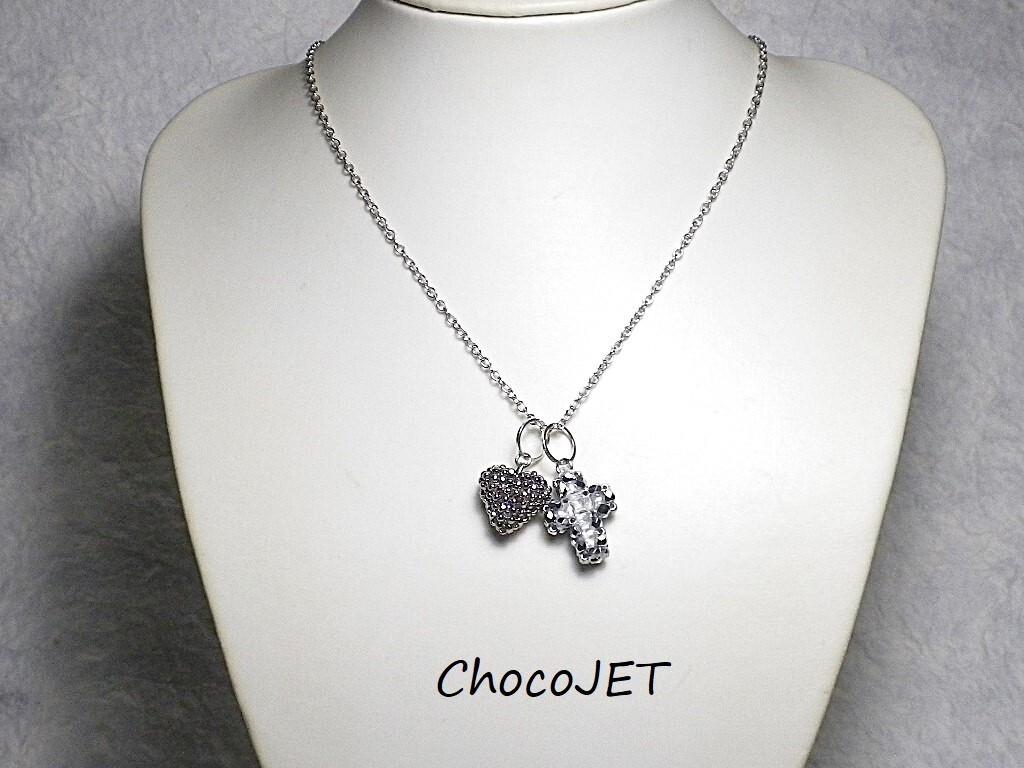 キラキラ輝くカットビーズのミニハートとミニクロスのカジュアルネックレスです。