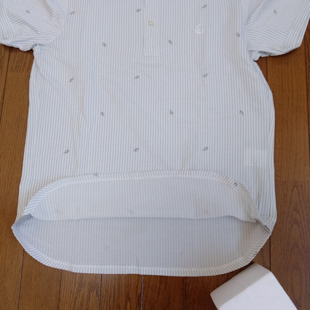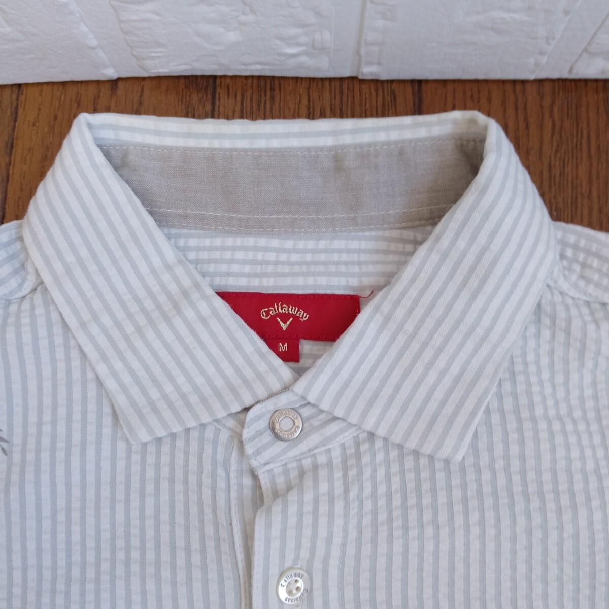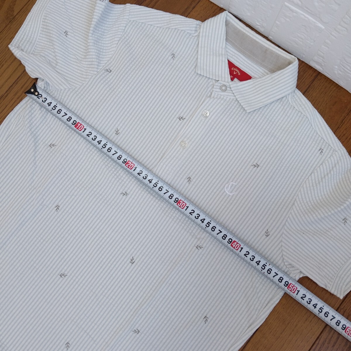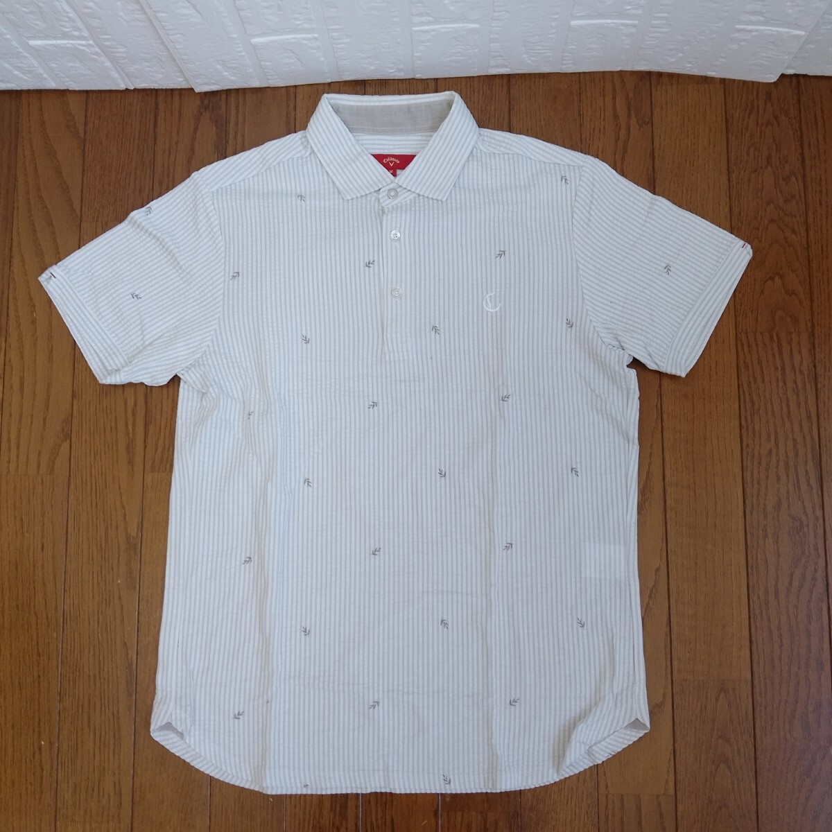 callaway半袖ポロシャツです。色は白/緑グレーのストライプに草花のデザインがあります。前ボタン3つ、袖スリット付き、赤いアクセント付き、左胸には白の『C』のロゴ刺繍、ネック裏には赤い布プレートに『callaway V』のデザインが付いて居ます。裾は丸型です。