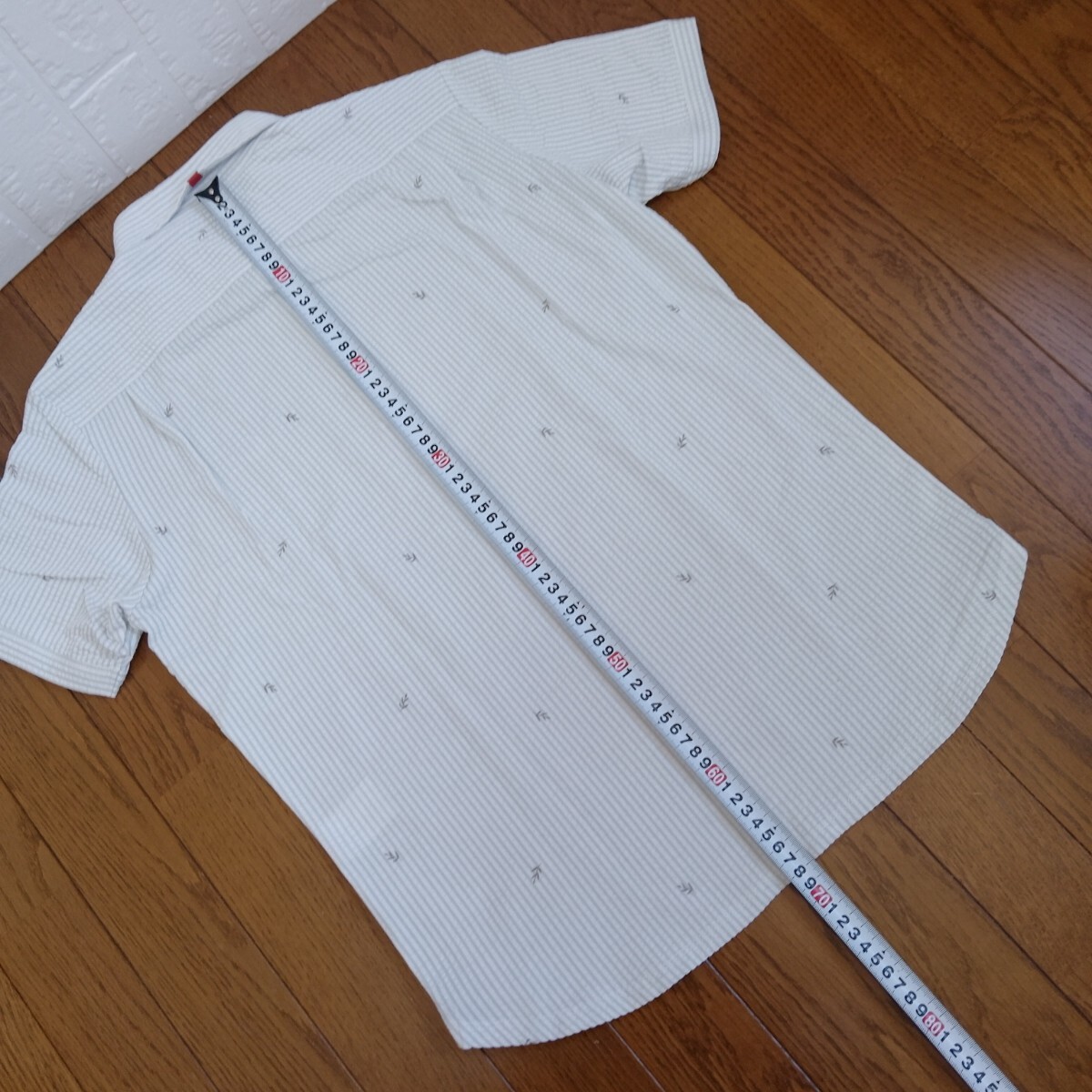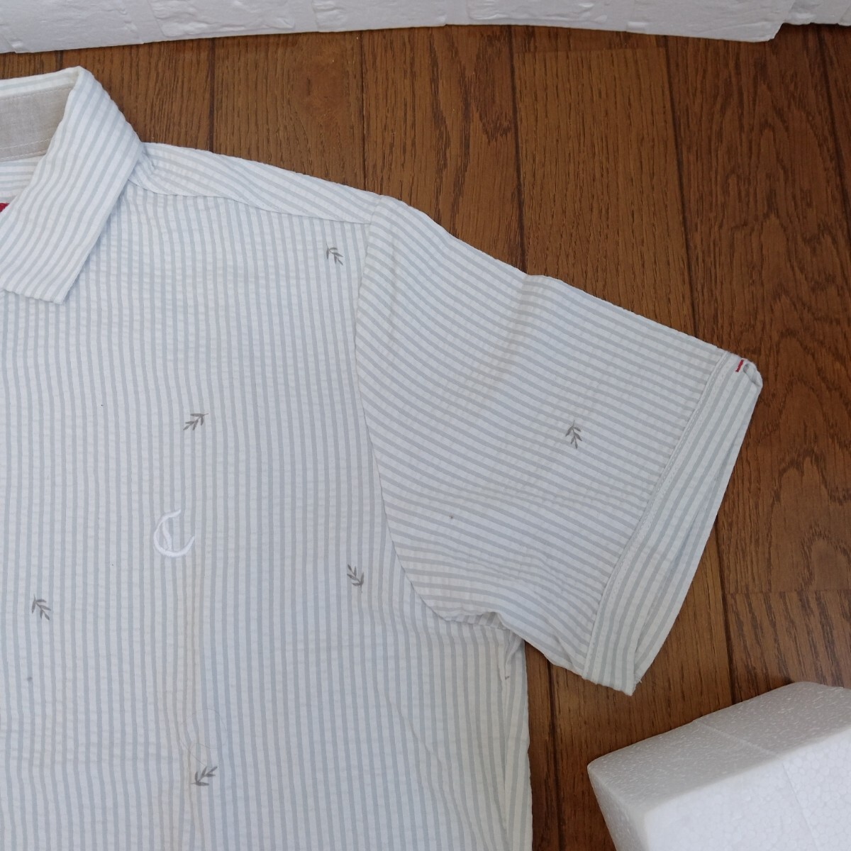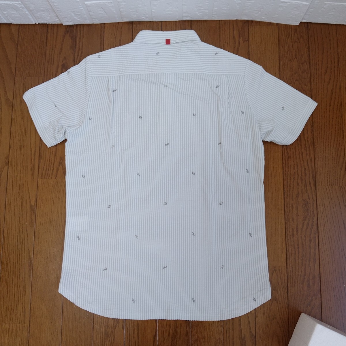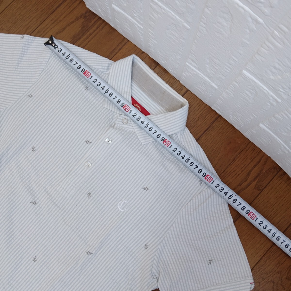 callaway半袖ポロシャツです。色は白/緑グレーのストライプに草花のデザインがあります。前ボタン3つ、袖スリット付き、赤いアクセント付き、左胸には白の『C』のロゴ刺繍、ネック裏には赤い布プレートに『callaway V』のデザインが付いて居ます。裾は丸型です。