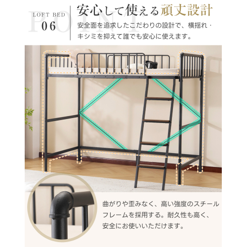 • 【ロフトベッドのメリットとは?】部屋のスペースを有効活用できます。ベッドの下に大きな家具や収納用品などを置くことで、部屋を広く使えます。寒い季節に暖かく過ごせますよ。暖かい空気は部屋の上のほうに溜まるので、低い位置にベッドを置いたときよりもロフトのほうが快適に過ごせます。狭い部屋にもぴったりです。限られたスペースを最大限に活用し、お部屋をすっきりして広く見せられます。