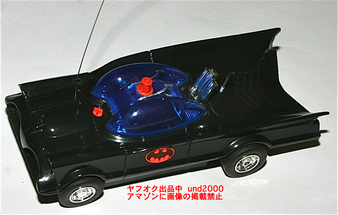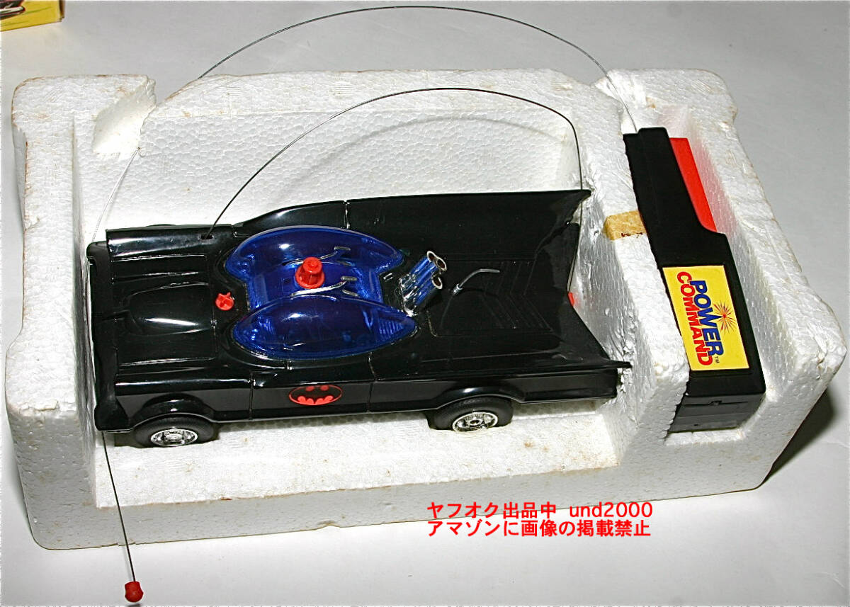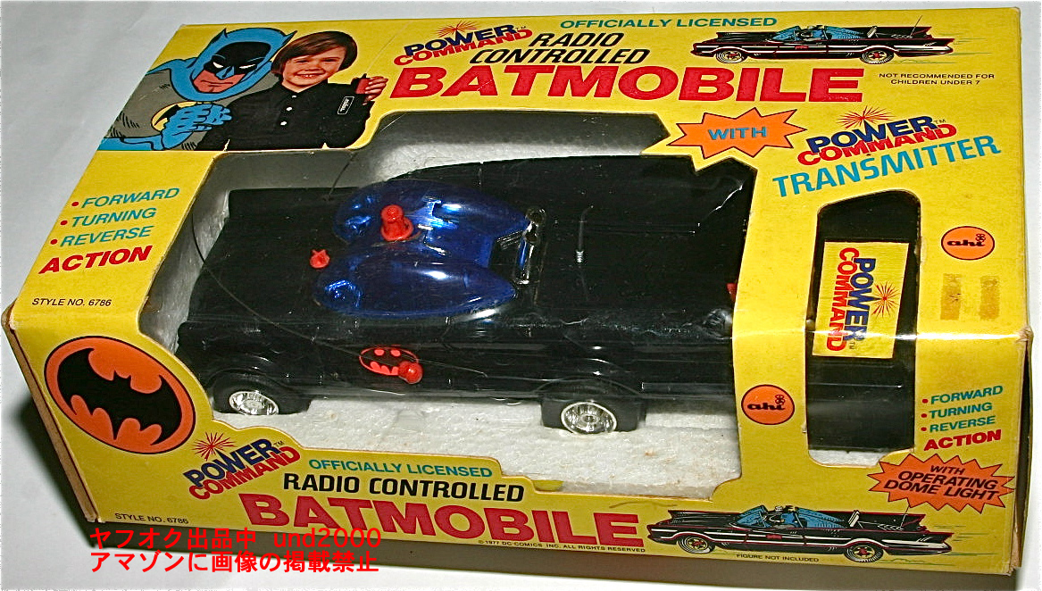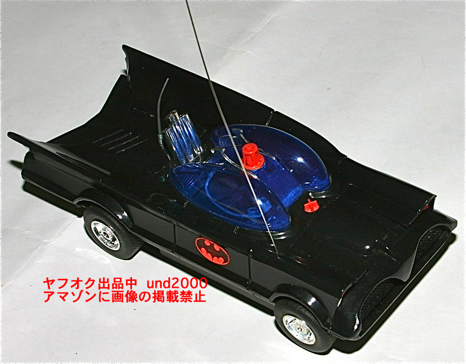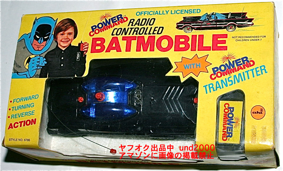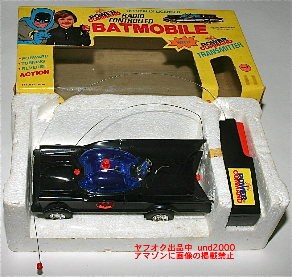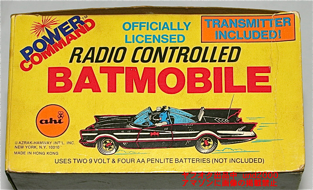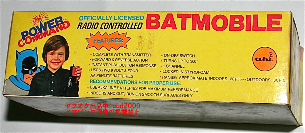 AHI (Azrak-Hamway International Inc.)、Power Command Radio Controlled Batmobile。1977年ごろの製品。プラスチック製。本体全長約20センチ。ホンコン製。本体に単三電池4本、9V電池1個、送信機に9V電池1個が必要です(別売り)。シャーシのスイッチを入れた時点でコントローラーと関係なく、屋根の赤いランプが点灯し前進を始めます。コントローラーのボタンを押すと、旋回しながら後退します。はなすと、また前進します。元からコントローラーでは走行の停止はできません。走行を止める場合はシャーシのスイッチをオフにしなければなりません。本体は目立つ傷も無く良好。箱は経年による薄汚れ、窓部の透明ビニーの角に破れがあります。本体を中のトレーに固定するネジが無くなっています。中古で入手。画像に写っているものが全てになります。入手時から説明書のような物はありませんでした。古い物ですので、画像と説明をよくご確認の上、ノークレームでお願いいたします。お支払いはヤフーかんたん決済のみ。東京発、ゆうパック持込80サイズ(東京1010円 - 沖縄1690円)、または定形外郵便(追跡番号、保険無し)920円の発送となります。(上記の送料はこの出品物のみの料金となります。複数落札、同梱包発送の場合、重さ、サイズが変わりますので送料が変わります。)3日以内のご連絡、かんたん決済の支払期限内(通常5日、支払方法により異なります)のお支払い厳守でお願いします。入札される前に「自己紹介」もあわせてお読みください。 検索用ワード Batman Batmobile アヒ 香港 Hong Kong パワー コマンド ラジコン