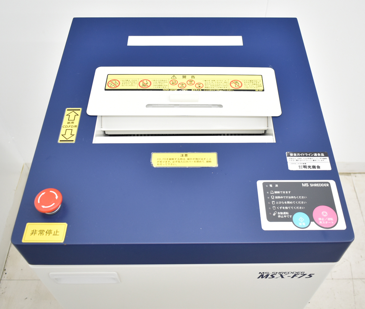 | ■備考 明光商会 MSシュレッダー MSX-F75 W500 明光商会のシュレッダーです。一度に75枚の細断を実現し、圧倒的パワーを備えた多機能ハイスペックモデルです。 パワークロスカット:高品質な円柱状の特殊鋼を使用し、精密な削り出しにより加工されたカッターは、大量細断向きで、素早くパワフルに書類を処理できます。枚数を多く入れるほど細断時にくずが圧縮されセキュリティ性を高めます(細断サイズ 約 3.9×40mm)。 ●データメディア細断 カード類、CD、FD、MOといったデータメディアの細断が可能で、万全のセキュリティ対策を行えます。メディアトレイをセットすることで細断くずを分別することができます。 ●くずならし機能(ファンプレス) 内蔵レベラーが回転して、細断くずをくず箱に均等に落としていき、さらに一定量のくずが溜まると隙間をうめるようにならしていきます。これにより、くずこぼれを格段に軽減させ、オーバーフローストップ(くず箱が満杯になると自動的に運転を停止する機能) ●非常停止スイッチ ユーザーの安全のために、天面の左手前に大きくわかりやすい非常停止スイッチを備えています。スイッチを押すと緊急停止し、スイッチを右に回転させると元に戻り、再スタートボタンを押すことで再度使用できます。 ●グラデーションランプ 細断する紙の投入量に応じて色が変化し、過投入による紙詰まりを防止します。投入前の電源ON時は「青」、投入後の最適枚数時は「緑」、多めの時は「黄」~「橙」~「赤」と色が変化します。「緑」の状態で使用して頂くのが理想です。 ●パワフル大量細断 高品質な円柱状の特殊鋼を精密な削り出しにより加工したカッターで、素早くパワフルに書類を細断します。モーターからのパワーを効率良く使用して長時間、安定的に大量の細断が可能です。メディアの細断も対応しています。 ※天板の塗装が浮いているのか凹凸がある部分があります。 ※アートセッティングデリバリー(家財おまかせ便)でのお届けとなります。 ※送料はお見積りとなります。 クリーニングとメンテナンスをしっかり行ってお届けします。 この商品の程度は中古品として美品といえます。 多少の擦れや傷はあるものの気になる程ではないでしょう。 御使用端末の環境により多少画像の表示色と実物の色に差違が生じる場合がございますのでご了承ください。 | |