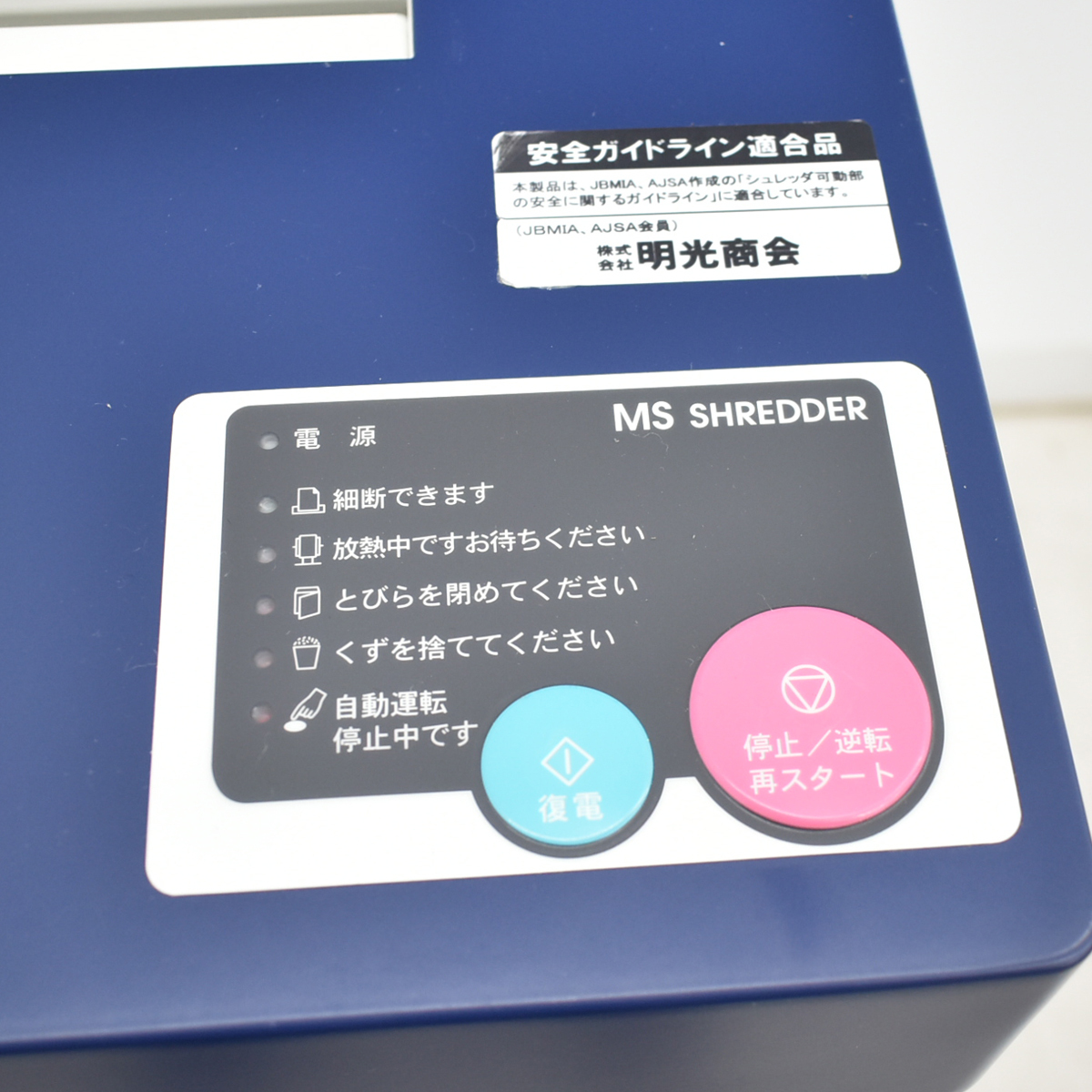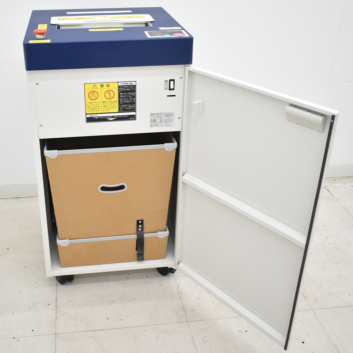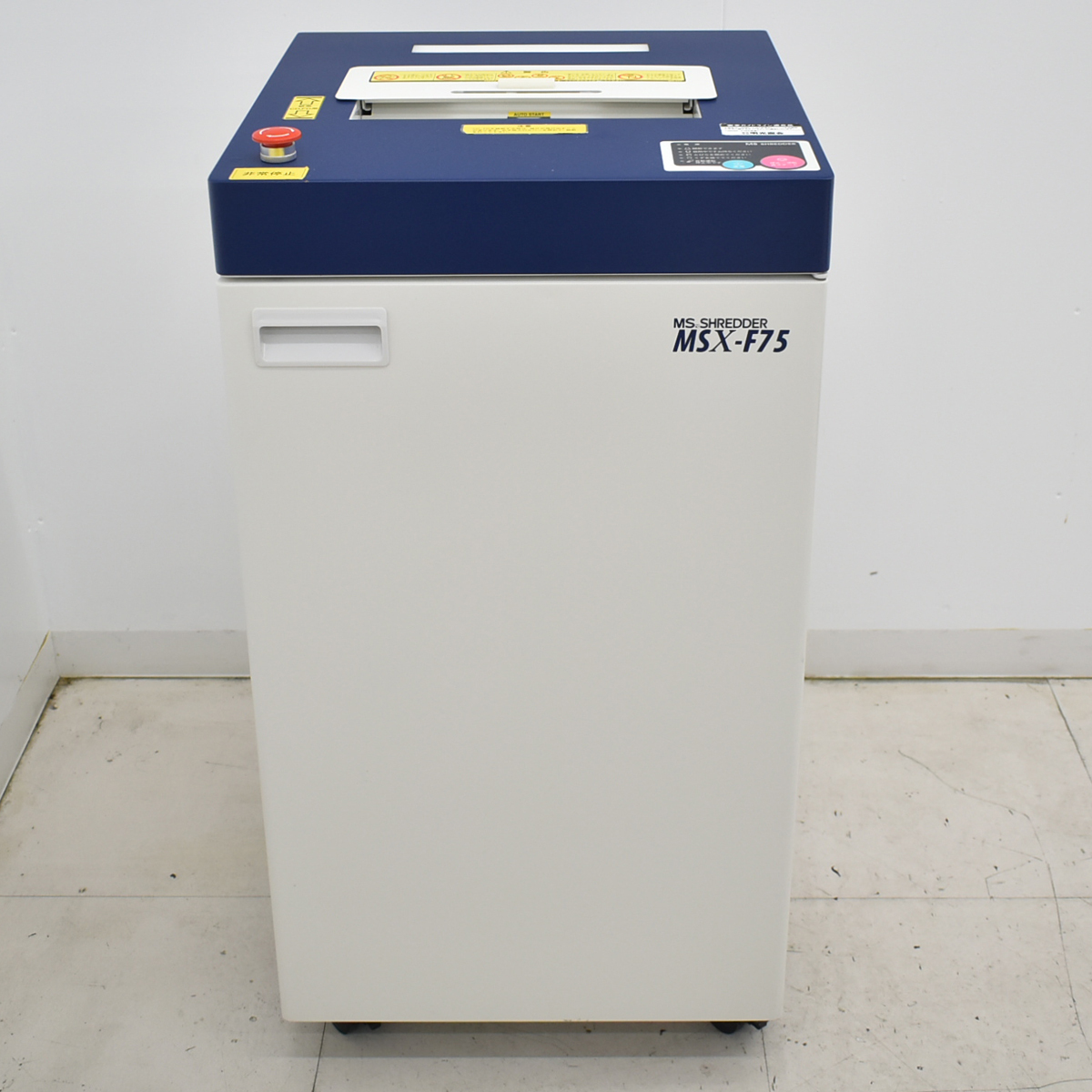 | ■備考 明光商会 MSシュレッダー MSX-F75 W500 明光商会のシュレッダーです。一度に75枚の細断を実現し、圧倒的パワーを備えた多機能ハイスペックモデルです。 パワークロスカット:高品質な円柱状の特殊鋼を使用し、精密な削り出しにより加工されたカッターは、大量細断向きで、素早くパワフルに書類を処理できます。枚数を多く入れるほど細断時にくずが圧縮されセキュリティ性を高めます(細断サイズ 約 3.9×40mm)。 ●データメディア細断 カード類、CD、FD、MOといったデータメディアの細断が可能で、万全のセキュリティ対策を行えます。メディアトレイをセットすることで細断くずを分別することができます。 ●くずならし機能(ファンプレス) 内蔵レベラーが回転して、細断くずをくず箱に均等に落としていき、さらに一定量のくずが溜まると隙間をうめるようにならしていきます。これにより、くずこぼれを格段に軽減させ、オーバーフローストップ(くず箱が満杯になると自動的に運転を停止する機能) ●非常停止スイッチ ユーザーの安全のために、天面の左手前に大きくわかりやすい非常停止スイッチを備えています。スイッチを押すと緊急停止し、スイッチを右に回転させると元に戻り、再スタートボタンを押すことで再度使用できます。 ●グラデーションランプ 細断する紙の投入量に応じて色が変化し、過投入による紙詰まりを防止します。投入前の電源ON時は「青」、投入後の最適枚数時は「緑」、多めの時は「黄」~「橙」~「赤」と色が変化します。「緑」の状態で使用して頂くのが理想です。 ●パワフル大量細断 高品質な円柱状の特殊鋼を精密な削り出しにより加工したカッターで、素早くパワフルに書類を細断します。モーターからのパワーを効率良く使用して長時間、安定的に大量の細断が可能です。メディアの細断も対応しています。 ※天板の塗装が浮いているのか凹凸がある部分があります。 ※アートセッティングデリバリー(家財おまかせ便)でのお届けとなります。 ※送料はお見積りとなります。 クリーニングとメンテナンスをしっかり行ってお届けします。 この商品の程度は中古品として美品といえます。 多少の擦れや傷はあるものの気になる程ではないでしょう。 御使用端末の環境により多少画像の表示色と実物の色に差違が生じる場合がございますのでご了承ください。 | |