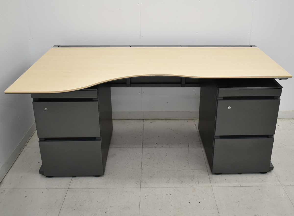 | ■備考 コクヨ レヴィスト デスク+ワゴン3点セット 幅1600 コクヨのレヴィスト・デスク+ワゴン3点セットです。 レヴィストは細部まで美しさと機能性を追求したデスクシステムです。 ●パネル脚 流れるようなフォルムのL脚に対し、ソリッドでスクエアな雰囲気を持つパネル脚。パネルを取り外すと中間脚として使用でき、頻繁なレイアウト変更にも柔軟に対応できます。 ●天板スリット センター引き出しやPCハンガー、パーソナルハンガーなどをワーカーが自在に取り付けられ、下肢空間を有効に活用できます。 ※デスク幕板部分にスレ、キズあります。 ※ワゴン背面に線キズなどあります(デスク下に入れてしまえば見えない位置です)。 ※鍵付。 ※分解梱包の上出荷いたします。商品到着後お客様による組み立て作業が必要となります。商品到着後お客様による組み立て作業が必要となります。 ※佐川急便ではなくJPロジスティクス(旧トールエクスプレスジャパン)・西濃運輸・自社便・チャーター便・チャーター便(混載)等で弊社の判断によりお届け方法を決定させていただきます。 4t車が進入できる路上までのお届けとなります。 トラック荷台上でのお引渡しとなります。 男性2名以上での荷受けを推奨しております。 日曜祝日の配達日指定が出来ません。 配達時間帯指定が出来ません(9~17時着・配達当日配送ルートが決まるため)。 4t車が進入できない場所への配送・日曜祝日着・配達時間帯指定・トラックからの荷下ろし作業・搬入作業・組立作業等をご希望である場合はお見積りにて対応となりますのでお申し付けください(お見積りできない場合がございます)。 クリーニングとメンテナンスをしっかり行ってお届けします。 この商品の程度は中古品として美品といえます。 多少の擦れや傷はあるものの気になる程ではないでしょう。 御使用端末の環境により多少画像の表示色と実物の色に差違が生じる場合がございますのでご了承ください。 | |